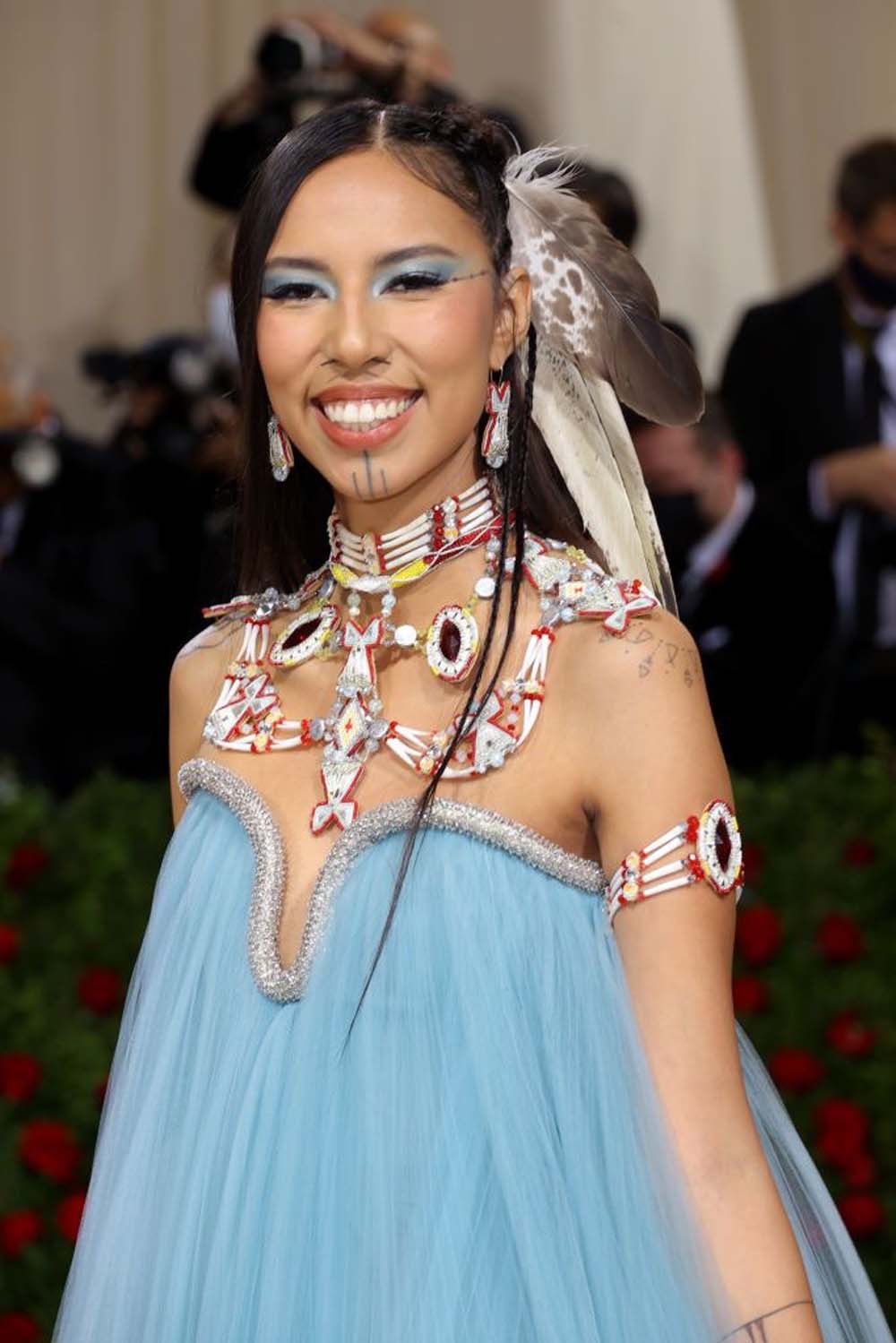Quannah Chasinghorse representing her indigenous roots with pride with two eagle feathers donated by indigenous people braided into her hair.