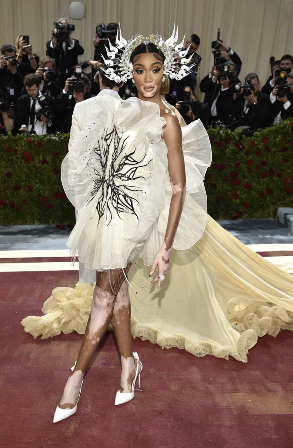 Winnie Harlow in an intricate Irish Van Herpen headpiece.