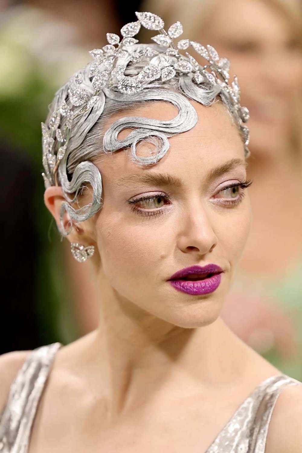 Amanda Seyfried in silver painted pin curls with a leaf motif tiara.