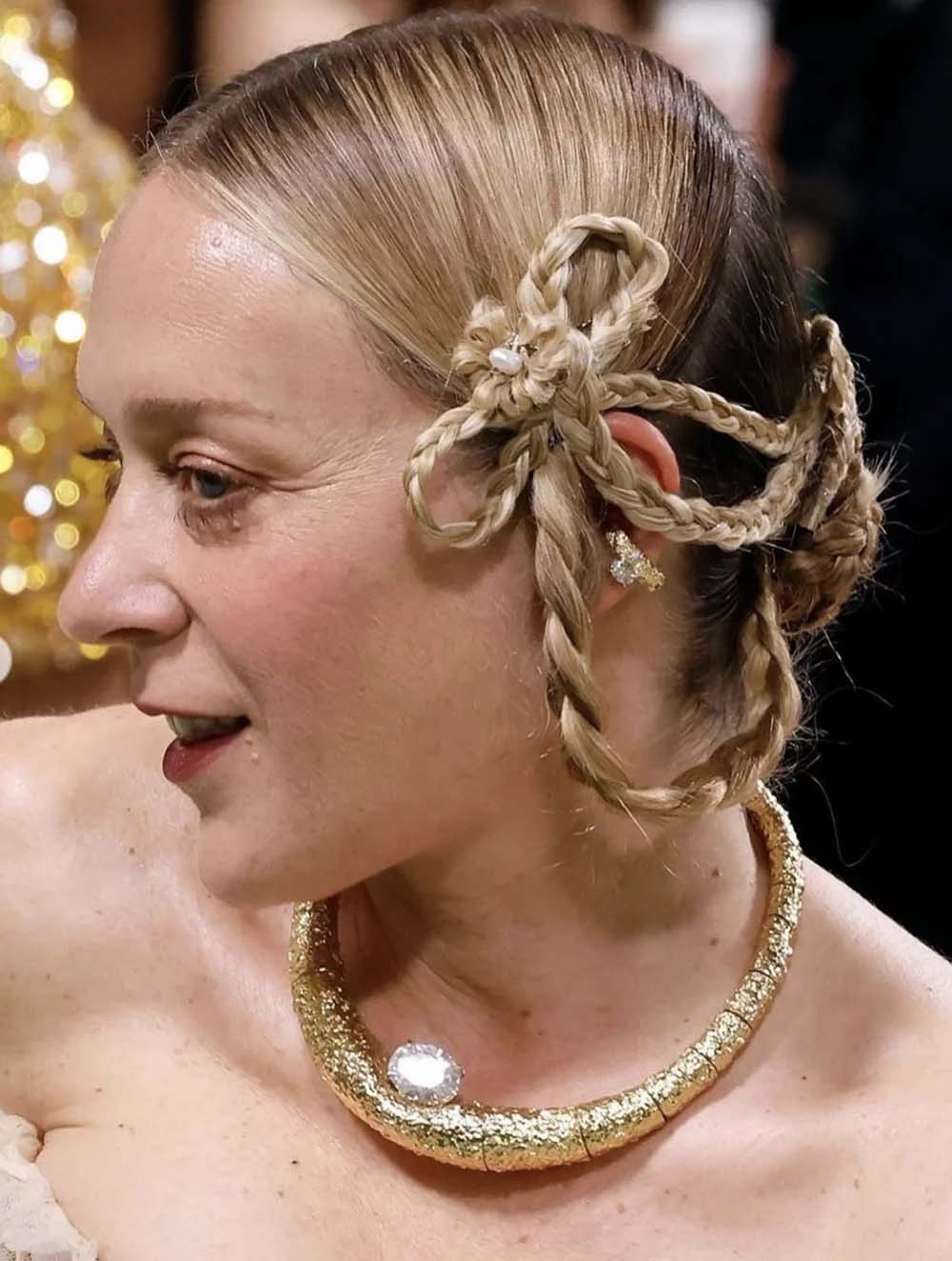 Chloe Sevigny in a braided bow hairstyle inspired by Victorian "mourning hair."