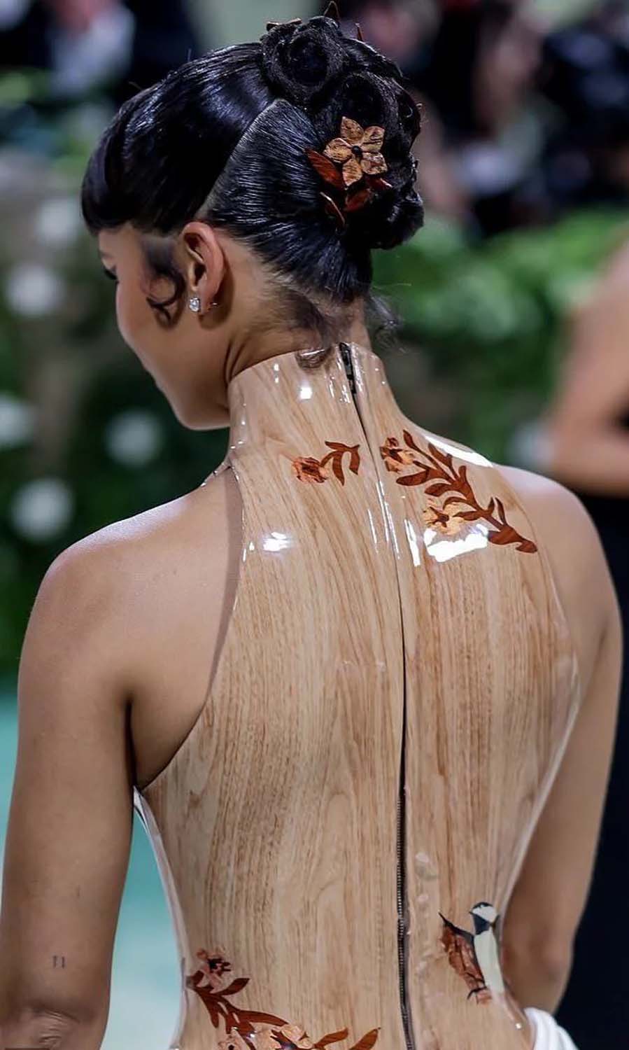 Taylor Russel's hair was accessorised with wooden-looking flowers to complete her Loewe look.