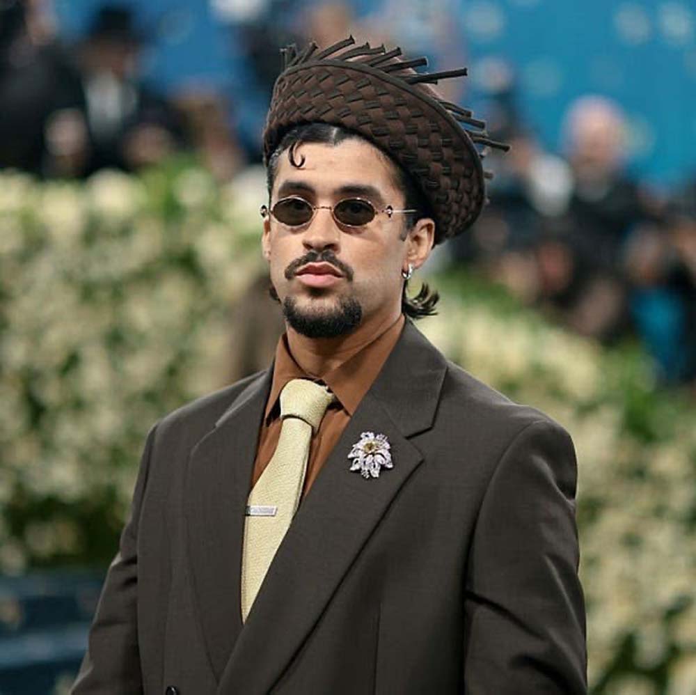 Bad Bunny paid homage to his Puerto Rican roots with this hat inspired by straw pavas, complete with a single curl and a middle part.