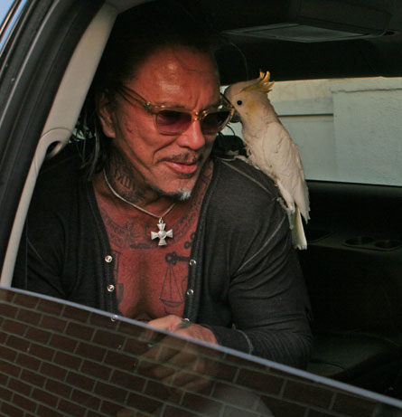 Mickey and Sonny the cockatoo. Is it just us or does he look like he could be Johnny Depp's dad / Iggy Pops brother?