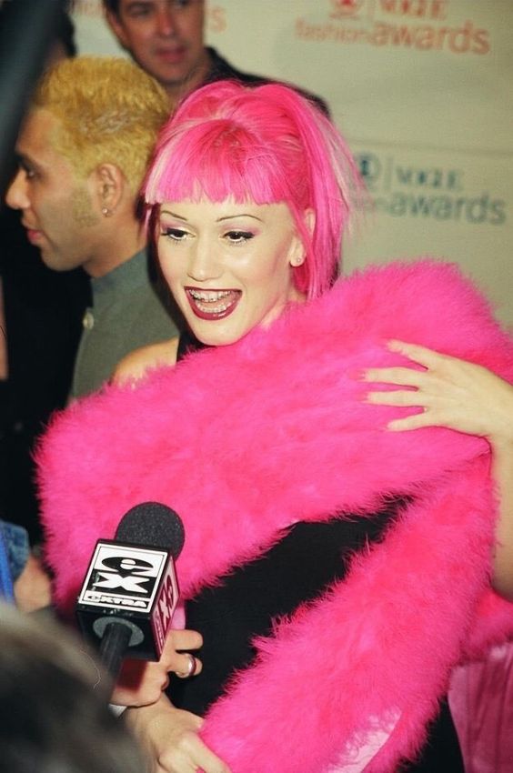Gwen Stafani with barbie pink bangs and fur to match at the VH1 Vogue Fashion Awards in 1999.