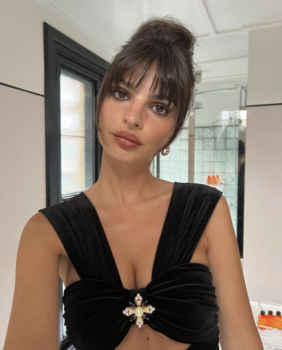 Emily Ratajkowski rocking her DIY bangs for the Self Portrait summer party in London 2023.