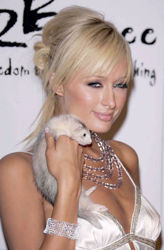 Nothing says 2006 like a cool toned smoky eye, gloss, pin-straight side bangs and a furry friend accessory - Paris Hilton at the 2 B Free's Spring 2006 Collection show.