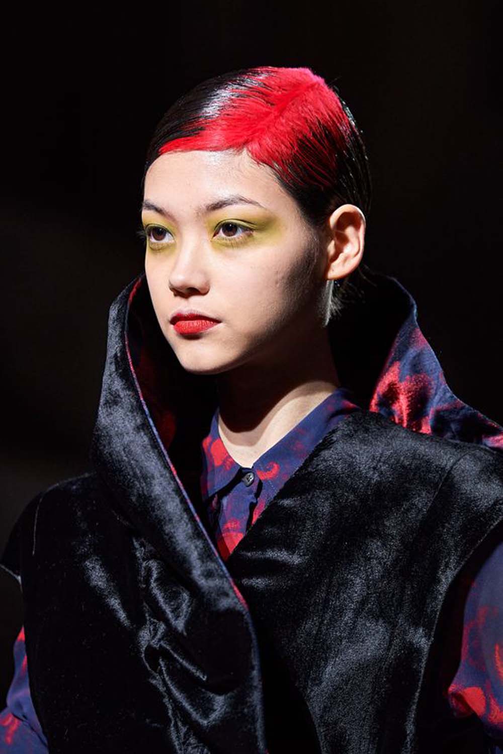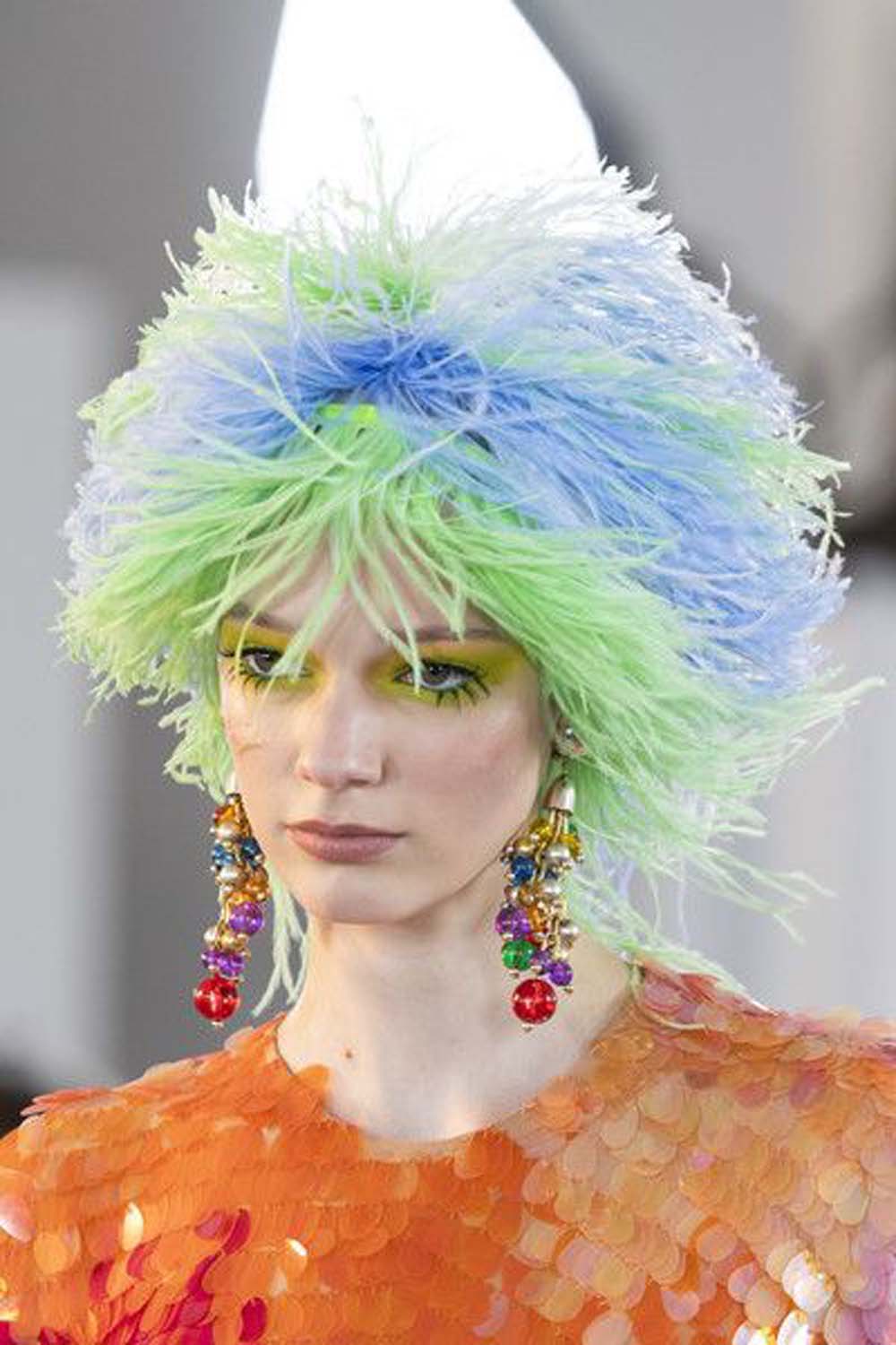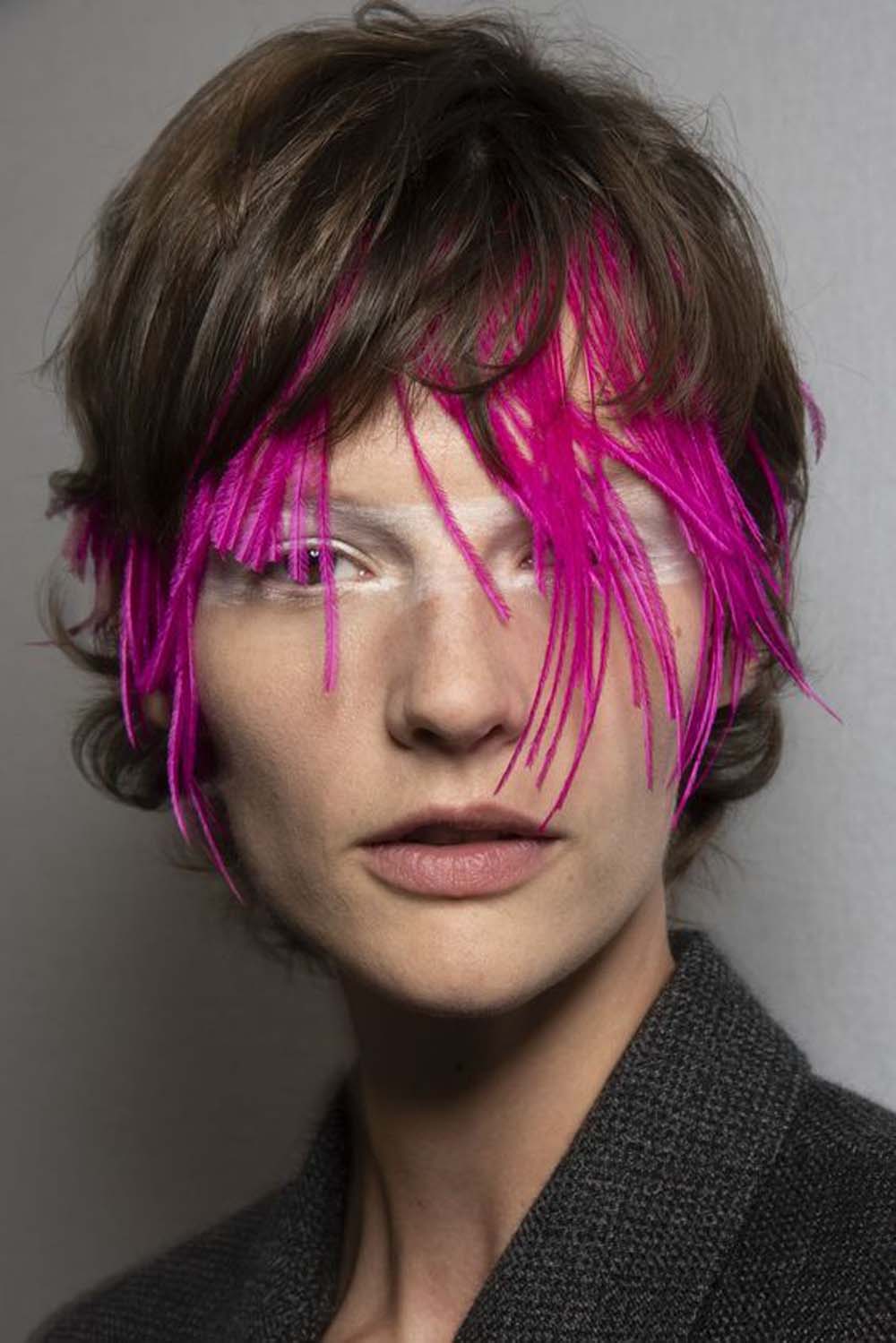Vibrantly coloured feathers combed and slicked down into the parting. Creating a striking ombre effect. The look, created by Sam McKnight, was inspired by the imagery Serge Lutens created in the late 70s and early 80s.