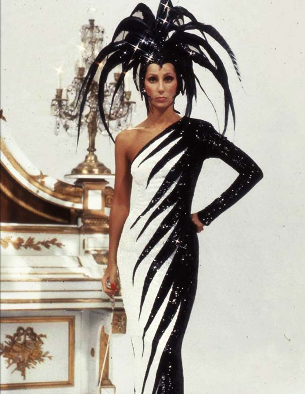 Cher wears a feathered headdress and gown designed by Bob Mackie for The Sonny & Cher Comedy Hour, 1973