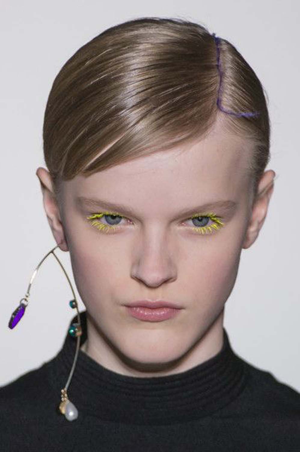 Single strands of ostrich feather barbs are placed subtly in the hairline, enhanced by a swipe of neon on the lashes and a sculptural earring.