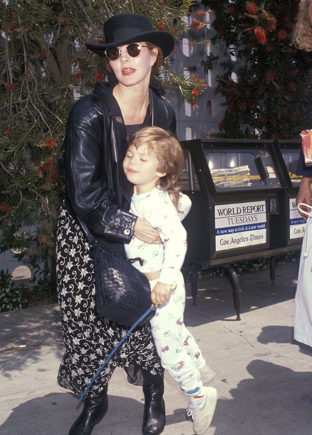 Quintessentially 90s in a flat top hat, leather jacket and hidden behind round gold-rim Ray Bans, photographed with her 3 year old son, Navarone Garibaldi.
