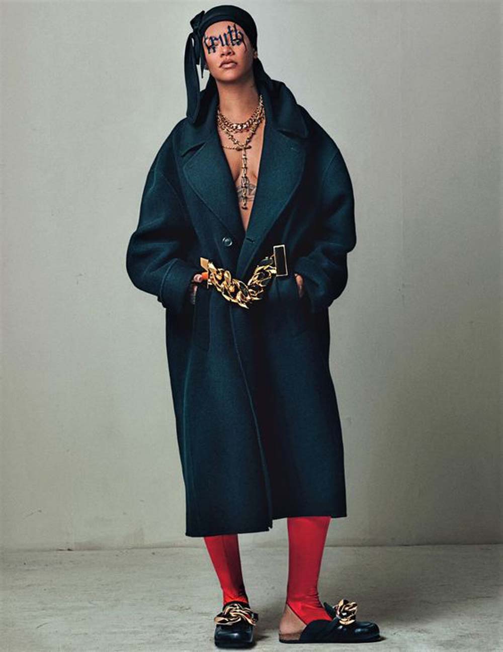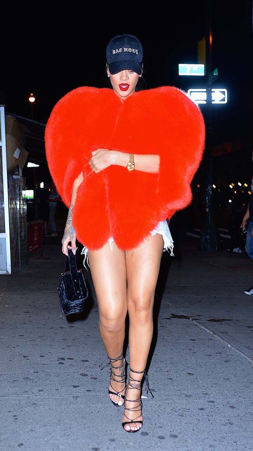 2016: Rihanna making her giant Saint Laurent Love Heart coat look like the perfect accessory to mini shorts and a cap.
