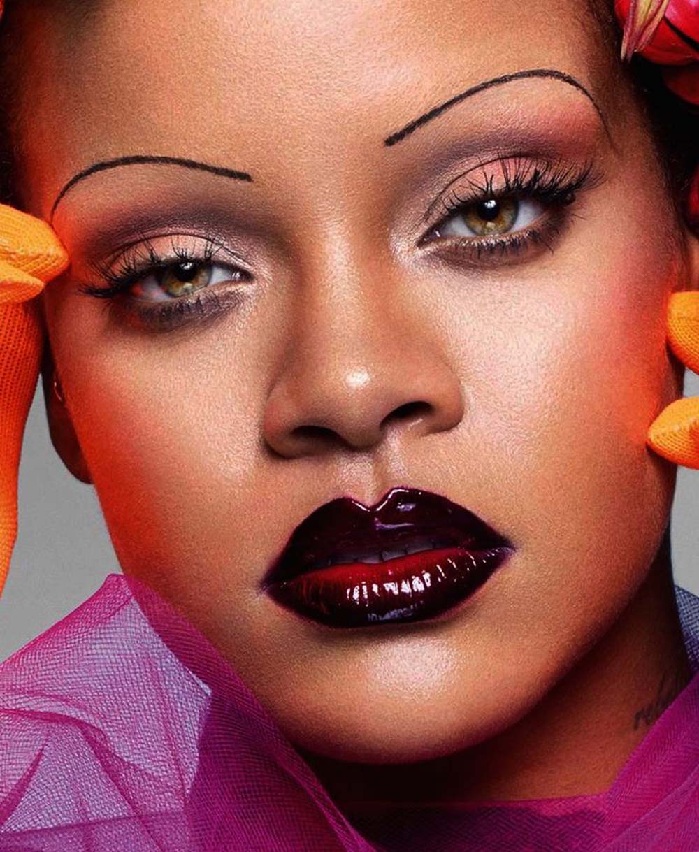 Decked out in a cotton mesh Louis V baseball cap with her leaning tower of fro' and a makeup look using only her own Fenty Beauty for Dazed 2021.