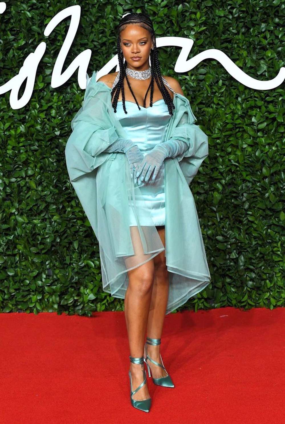Rihanna in monochromatic mint green, attending the 2019 British Fashion Awards in London.
