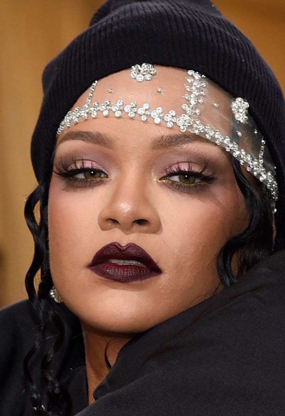 Always the Queen of intricate details in her blinged-out layered beanie and deep maroon-toned glam at the 2021 Met Gala.
