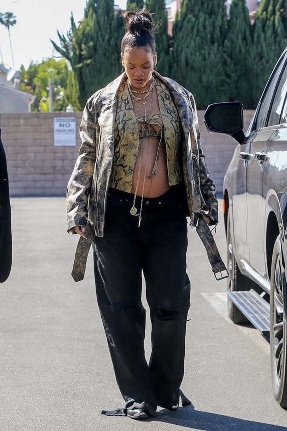 More 2022 baby bump content because it's just simply too good- RiRi wears a python leather vest by Acne Studios whilst stepping out for lunch in Beverly Hills.