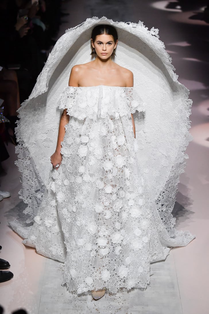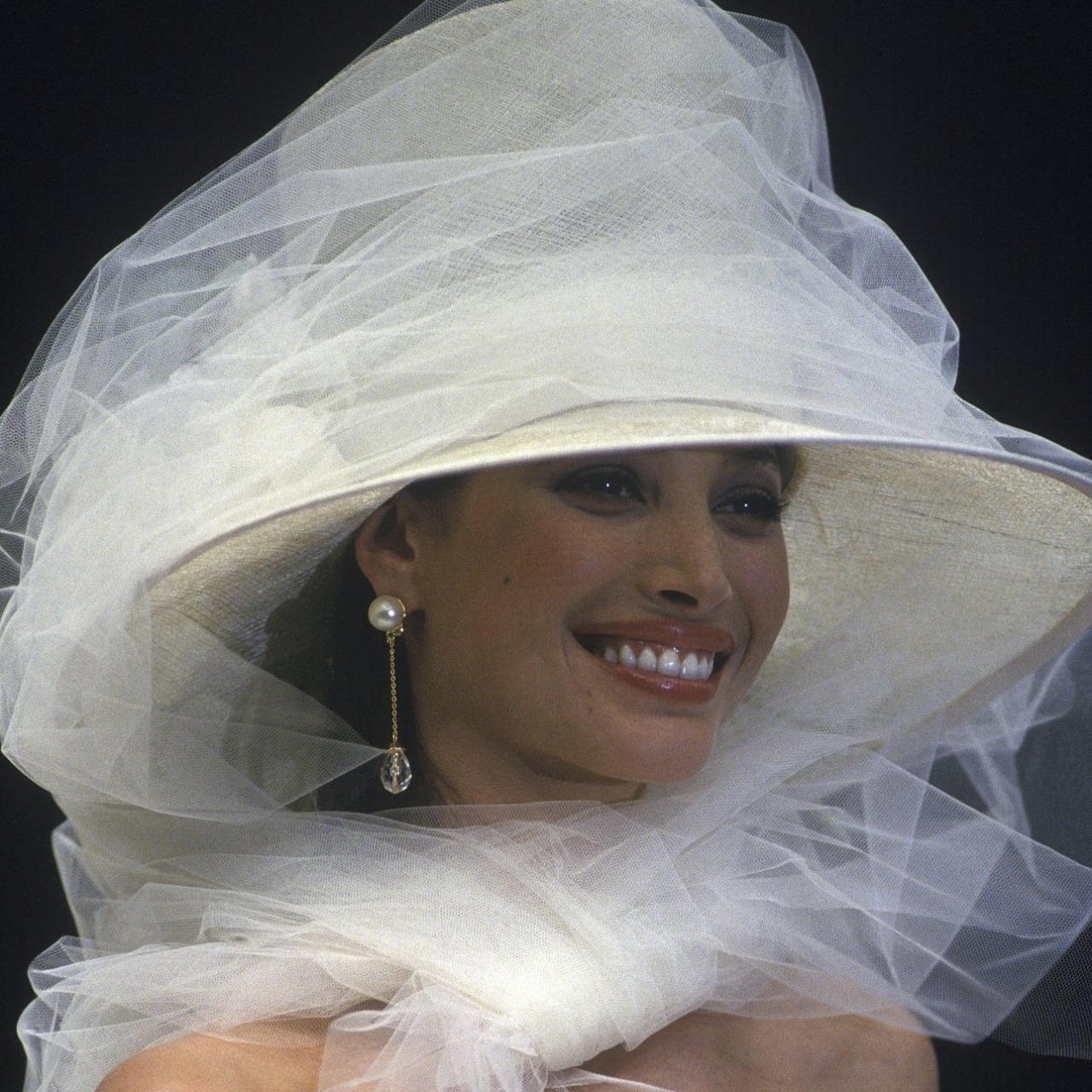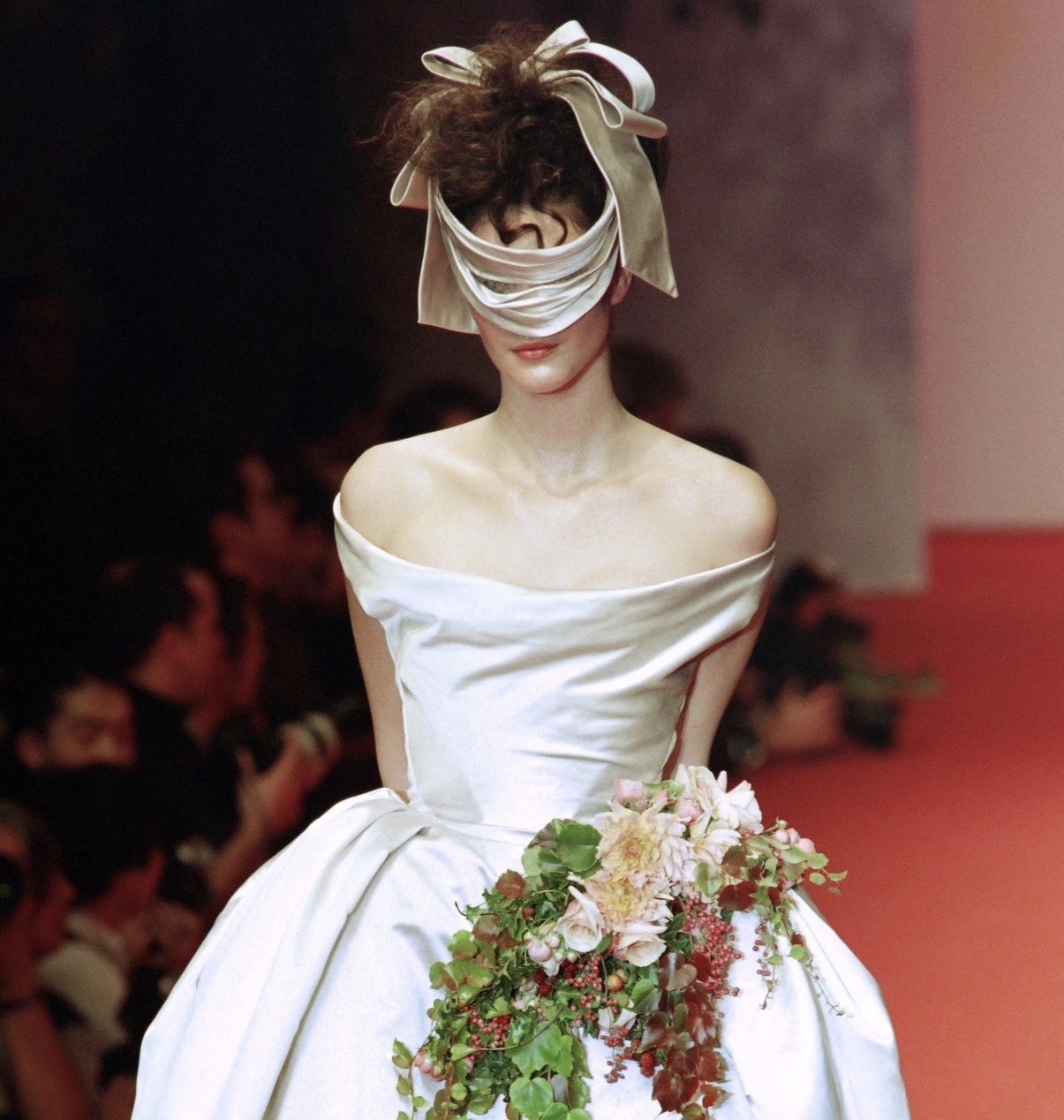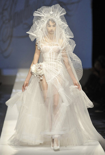 Another look, another glamorous bonnet. Bridal couture meets synchronized swimmer