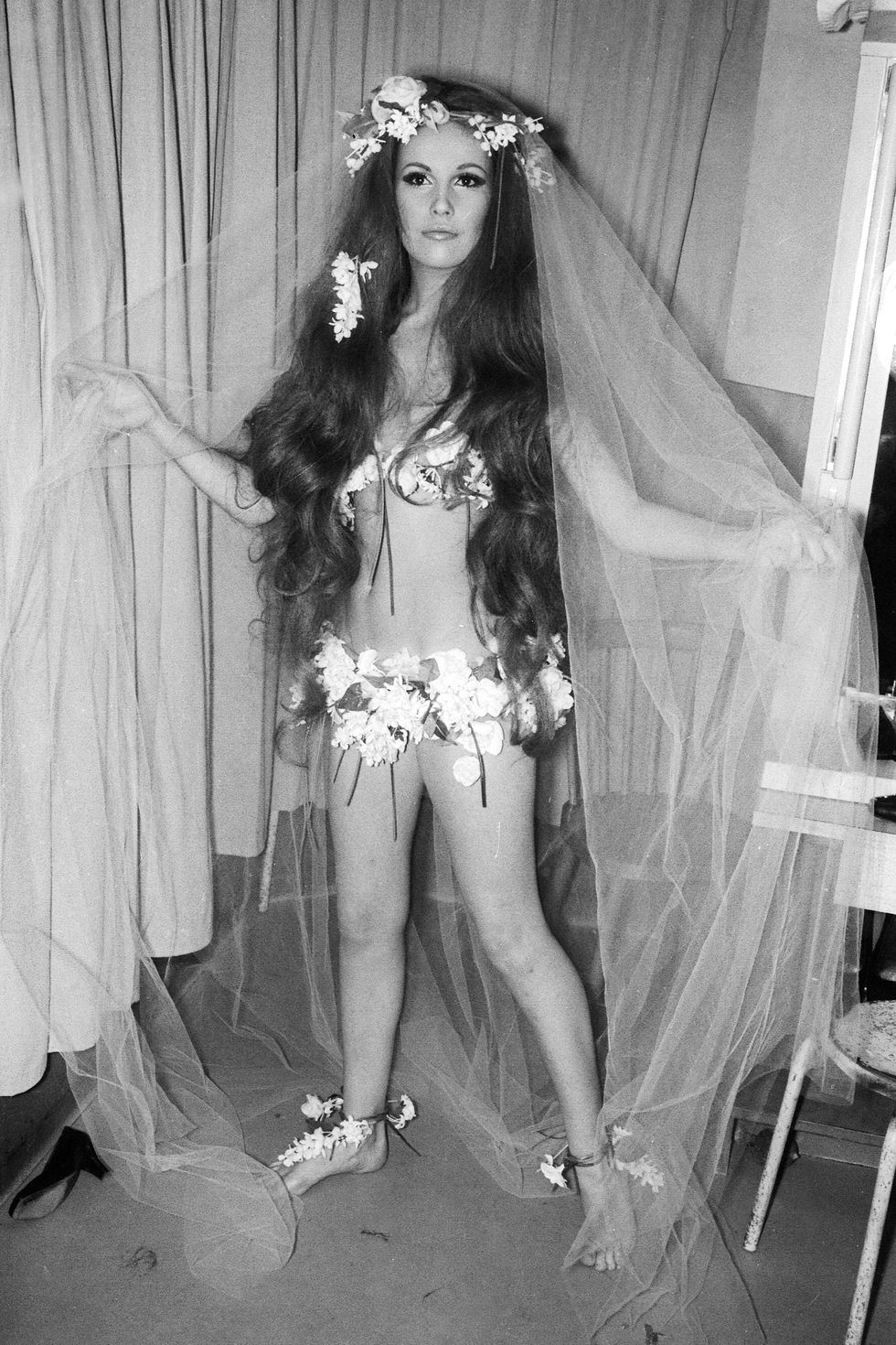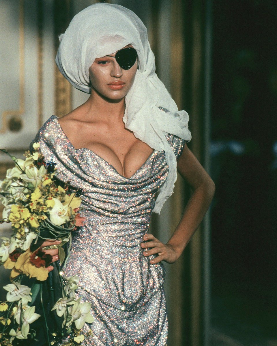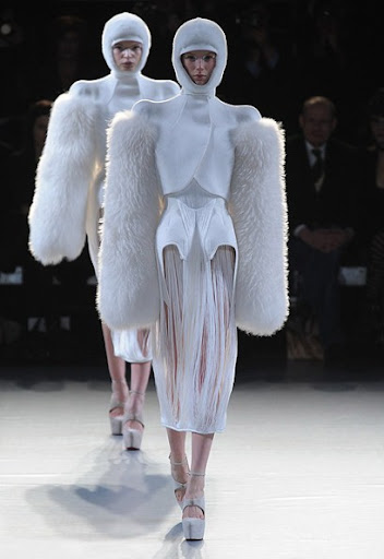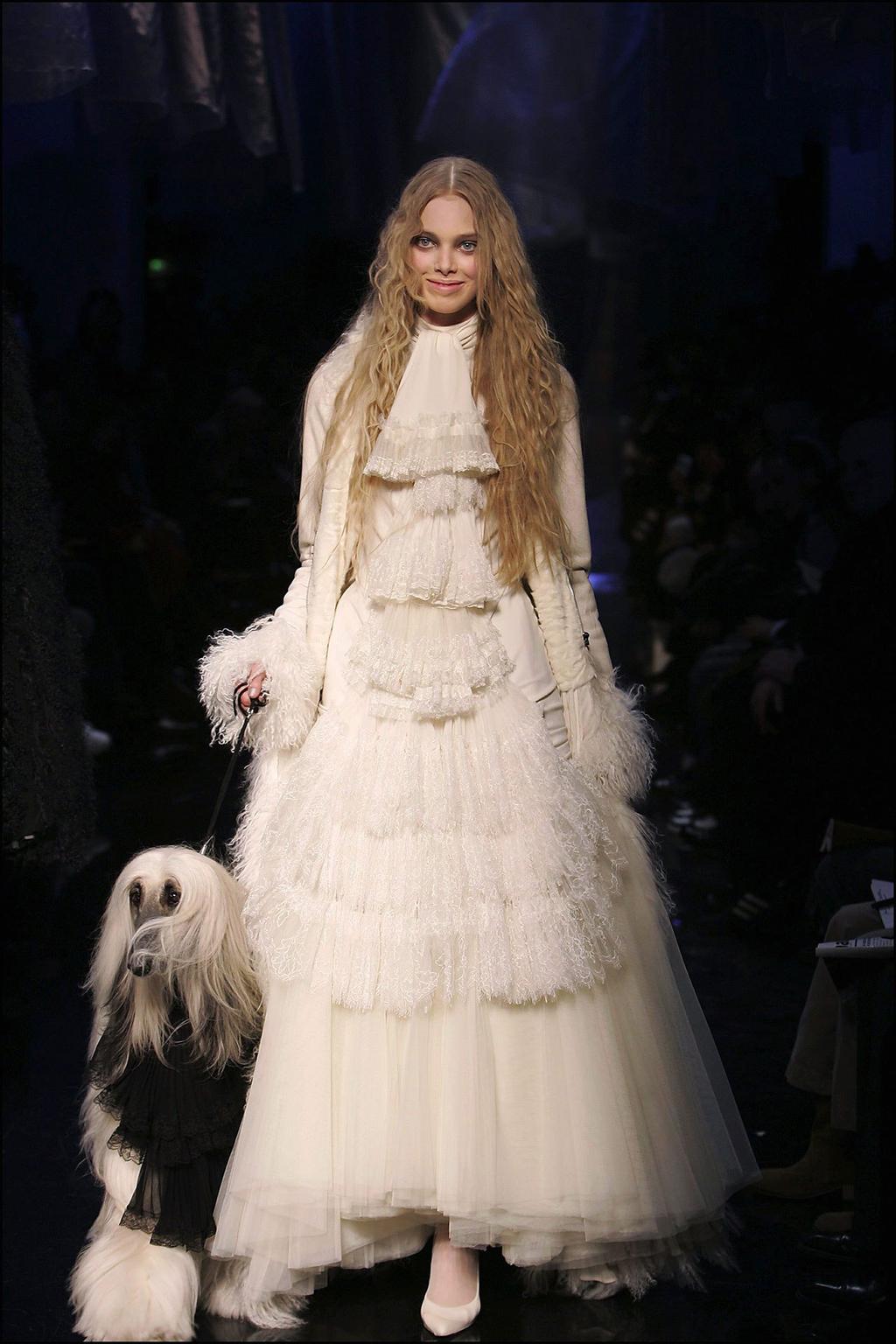 Another look, another glamorous bonnet. Bridal couture meets synchronized swimmer