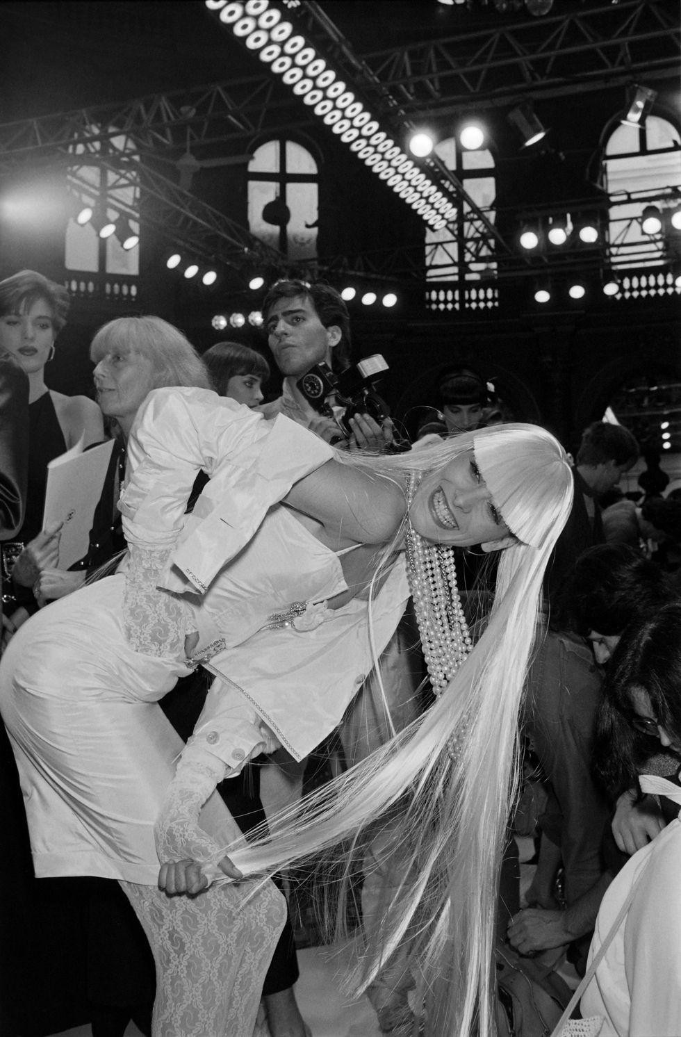 An idea for the maximalist; white lace bodysuit, vintage Chanel mini dress, stacked with pearls and perfect blunt-cut platinum bangs.