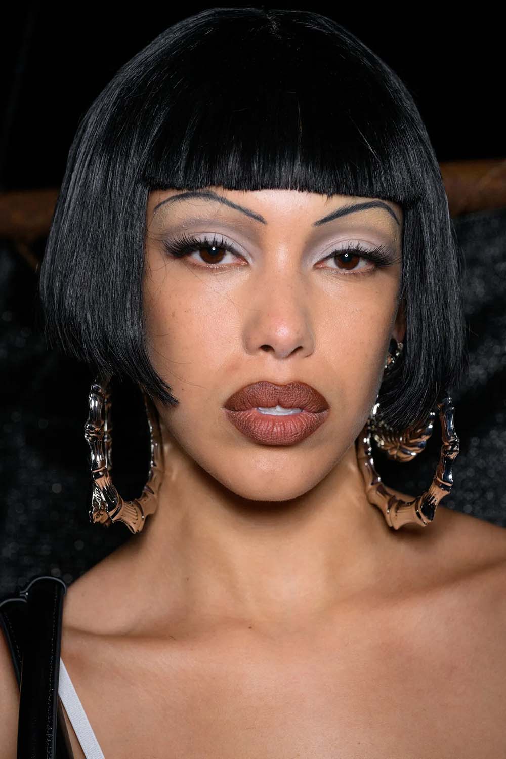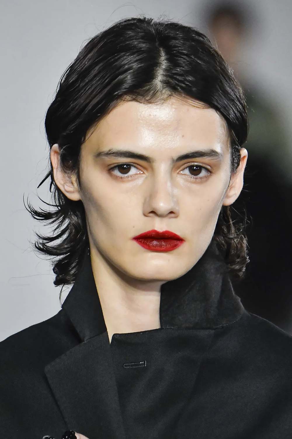 At Versace, Guido added blunt fringes, or razor-sharp bobs onto a handful of models, intermixed with bowl cuts to just skim the eyes and highlight the crimson feature lip.