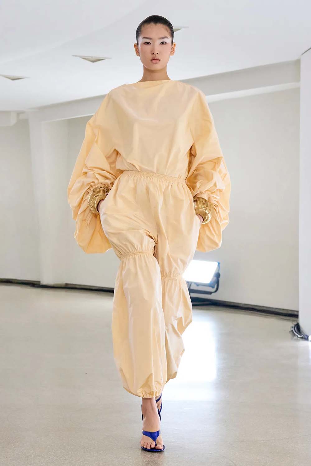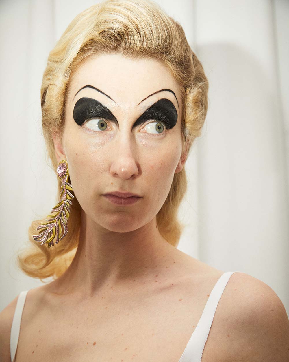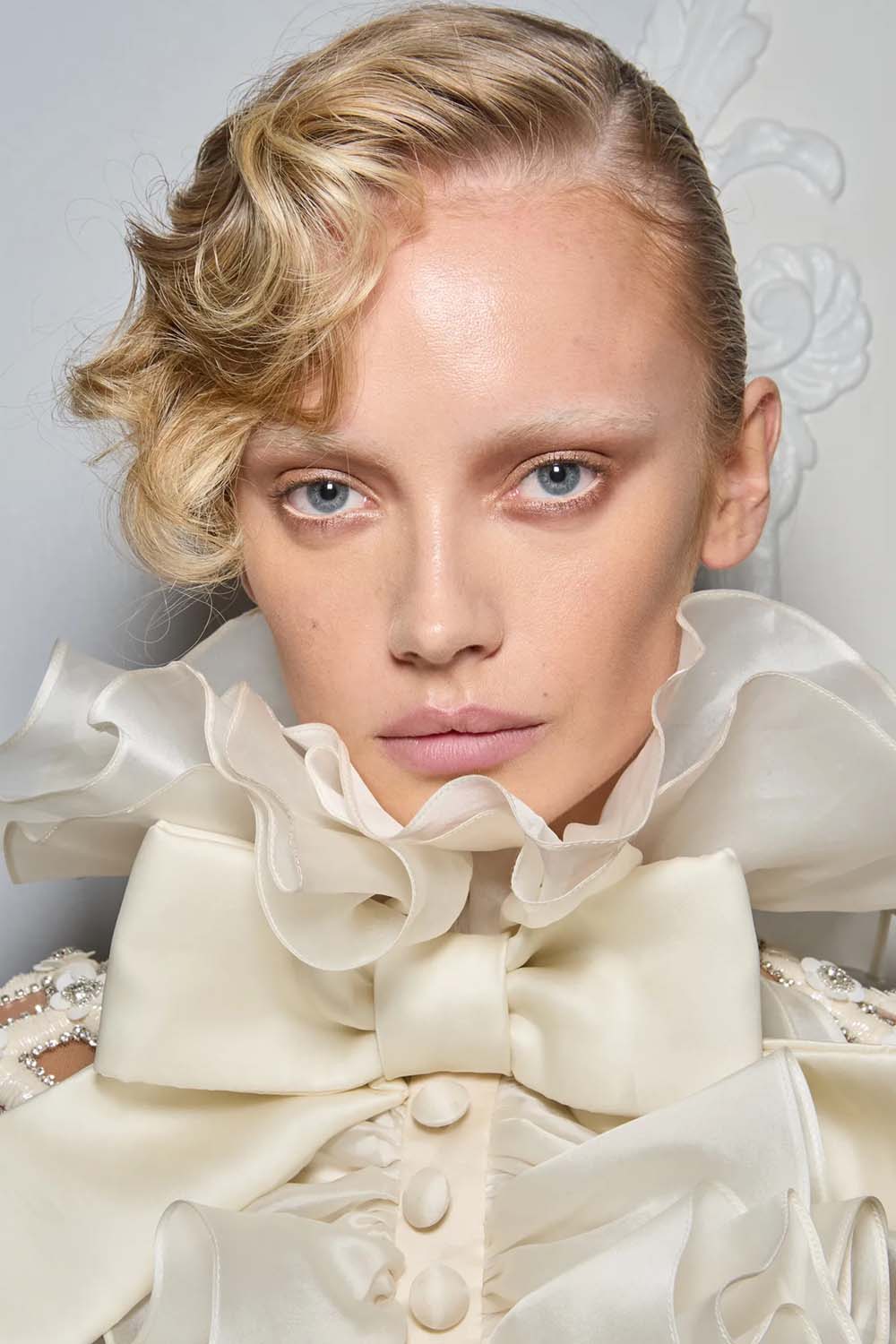 For Alaia, Pat created tonal beams across the eyes in shades of cream, nude, and chalky white extending out to the temples, like light beams across the face. And Richard Quinn we saw a muted hue of pink on the lips, a custom blend mixed up by the makeup wizard Terry Barber.