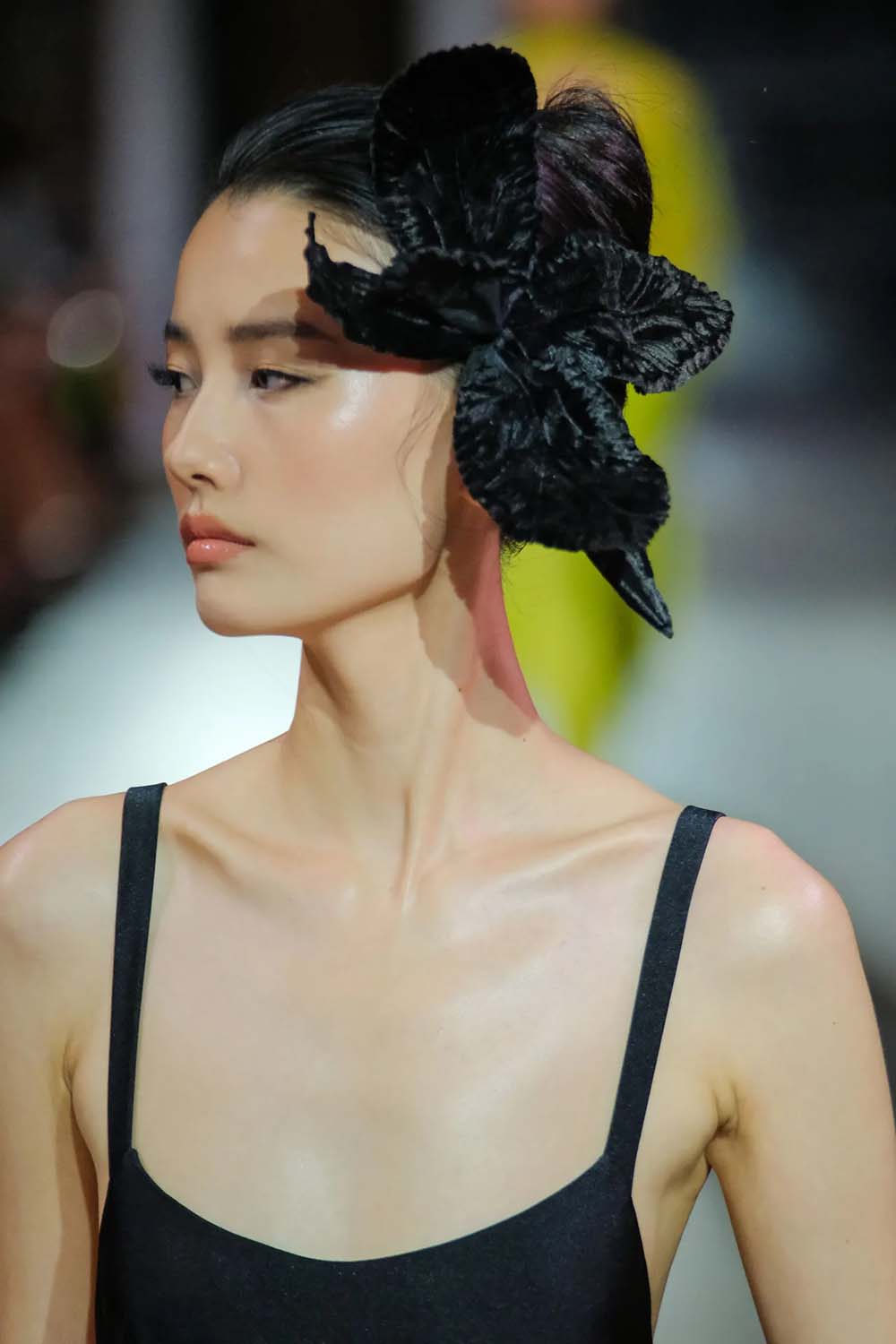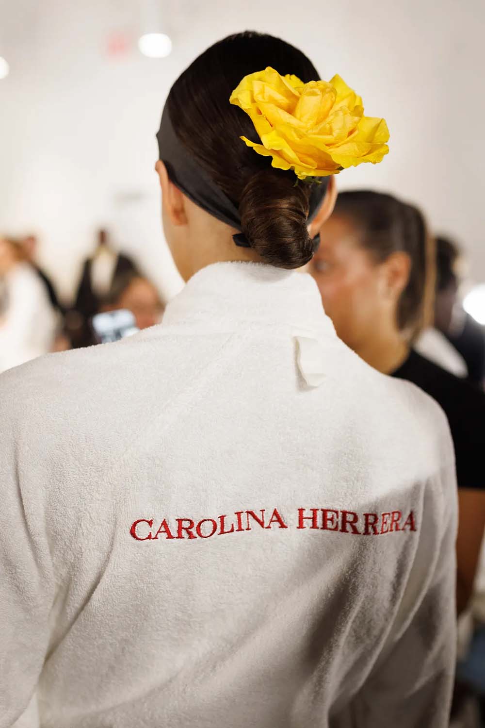 Gigantic florals set side of face at La Quan Smith set the mood in New York, followed by giant rays of sunshine placed in chignons at Carolina Herrera.