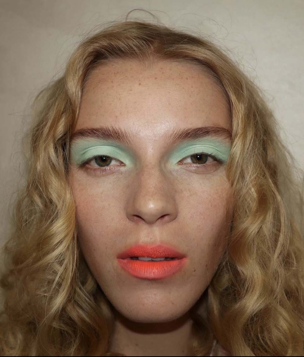 At All In Studio, Thomas DeKluyver created customised pastels for each model - some just eyes, some both an eye and lip combo featuring dreamy lilacs, mint green, dusty coral-peach lips or baby doll pink.