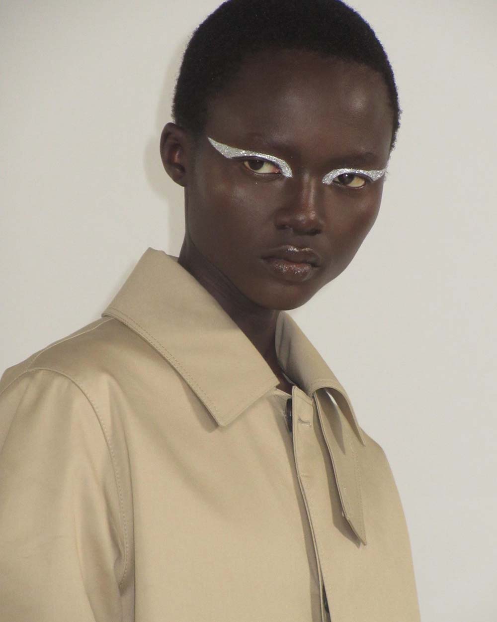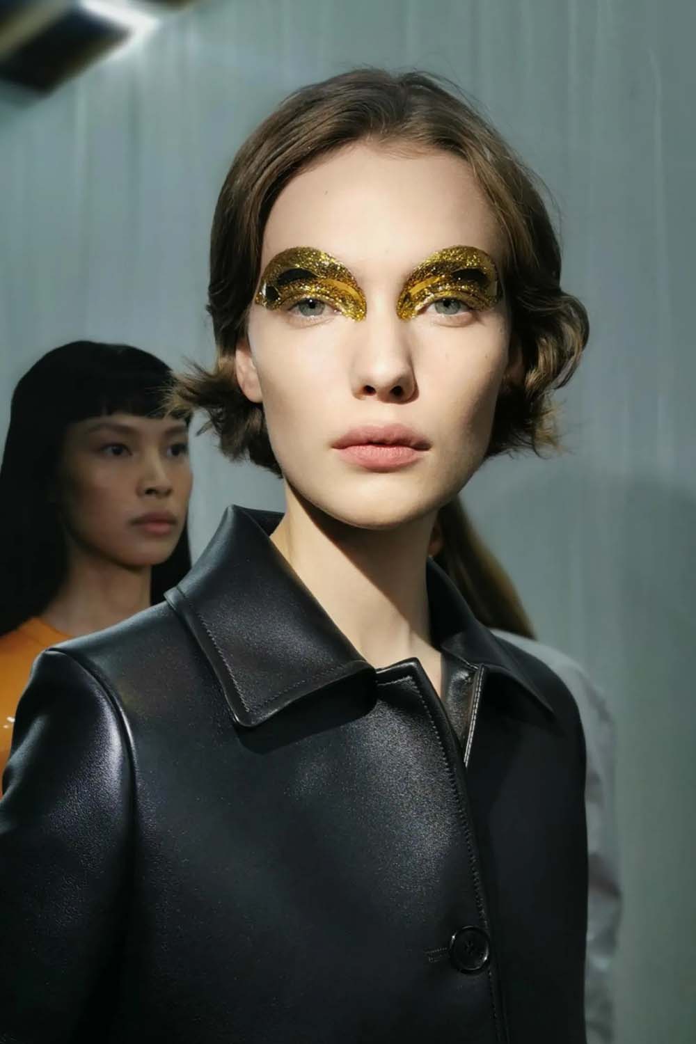 Out of the many custom looks at Loewe, one feature saw gold glitter adorned eyelids up over the brows, and also a razor-sharp silver glitter liner.