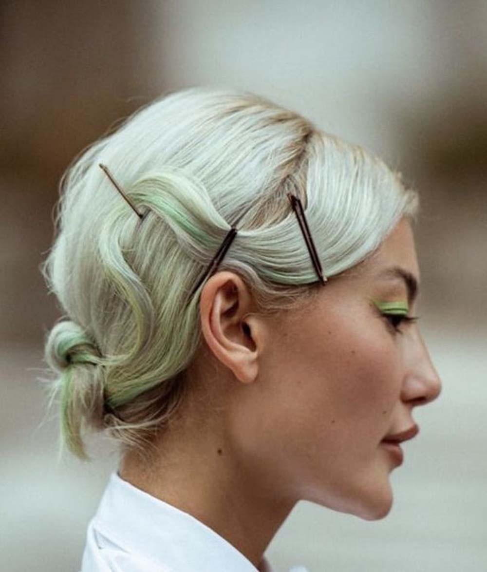 Using a spray wax and your fingers, gently comb all hair away from your face, be sure to maintain a loose and textured feel (the use of more spray wax will help with that). With your pins ready, gather your hair as if creating a pony and pin a vertical line down one side. The pinned side should be smooth but not sleek or flat to the scalp.