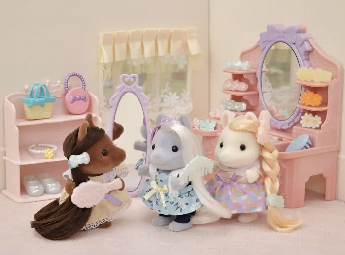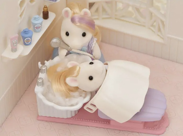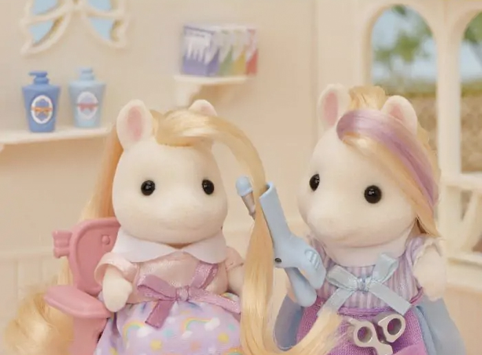 Chestnut Pony Vera and Silver Pony Giselle visit Pony the hairstylist at the Sylvanian salon.