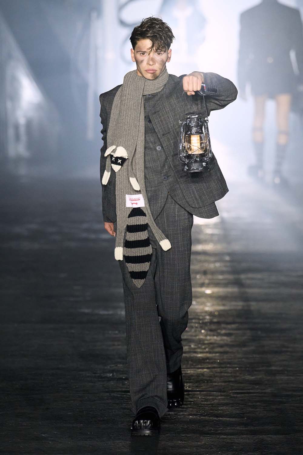 A traditional grey suit teamed with tousled, greasy hair and a sooty beauty look at Charles Jeffrey Loverboy.