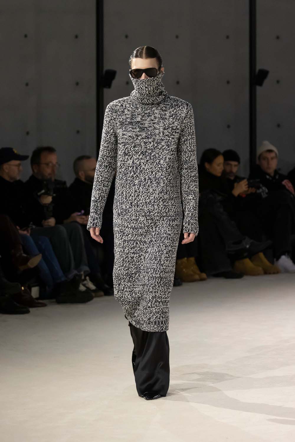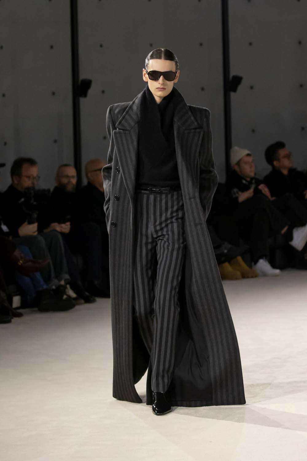 A grey striped floor-length coat paired with matching trousers. Saint Laurent brings the drama.