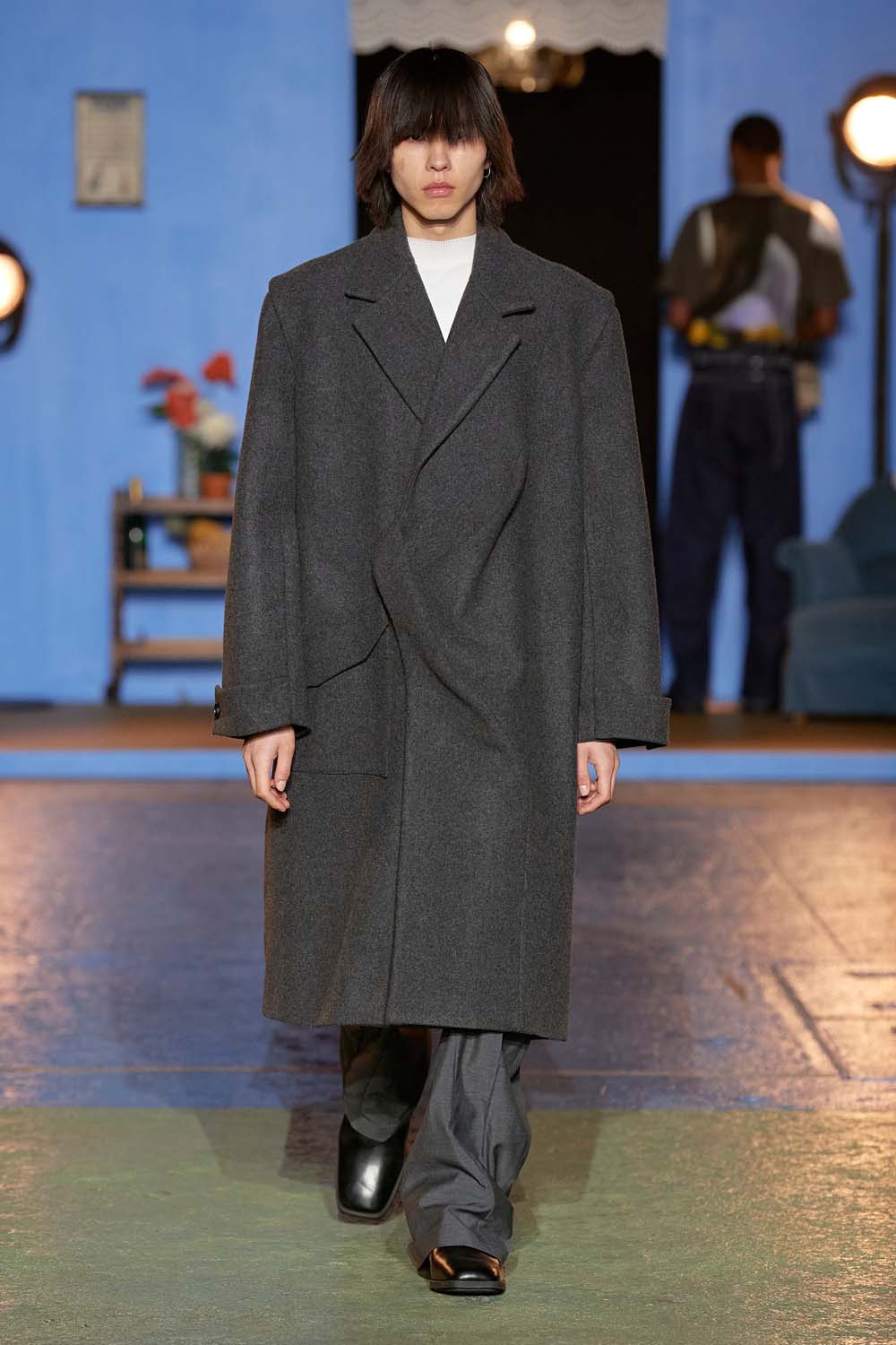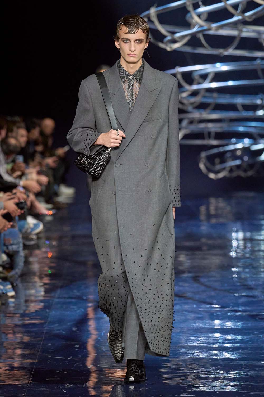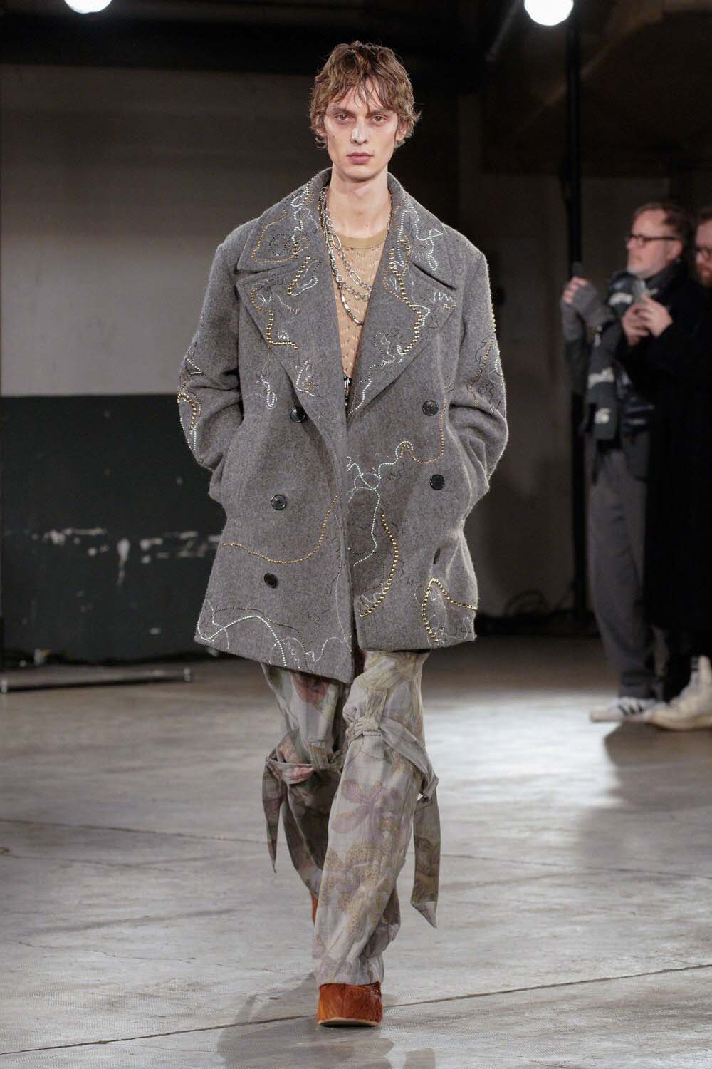 A grey peacoat gets a touch of embellishment at Dries Van Noten Fall 2023. The greasy post-rave-looking hair adds to the undoneness of the look.