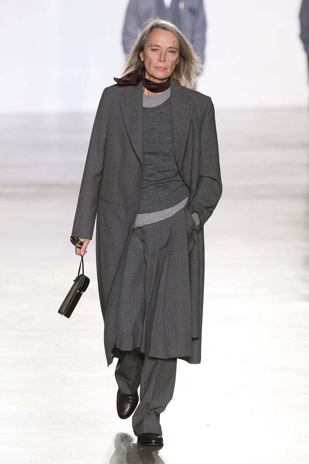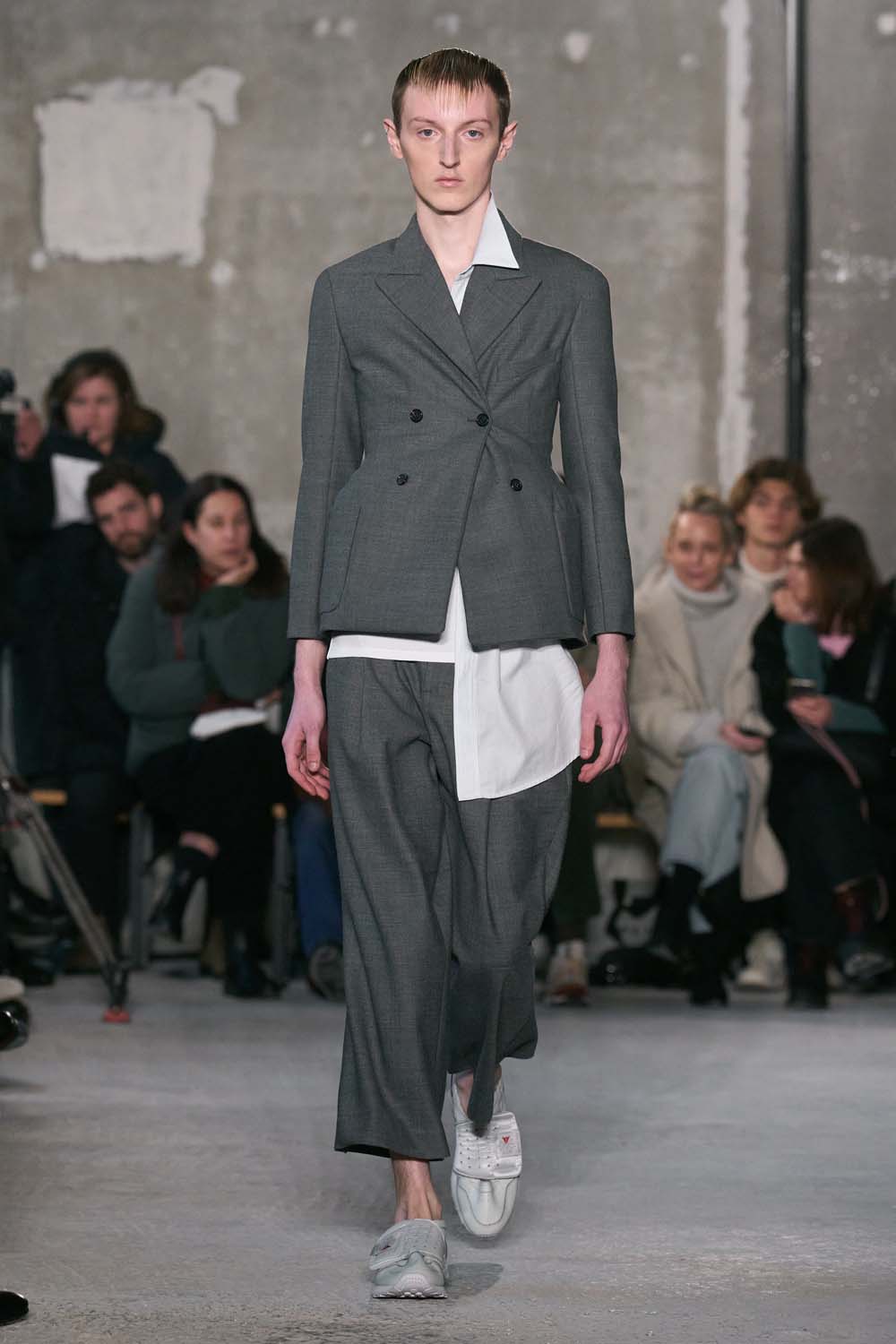 A model walks in layered greys for Officine Generale. Hair and beauty looks were paired back.