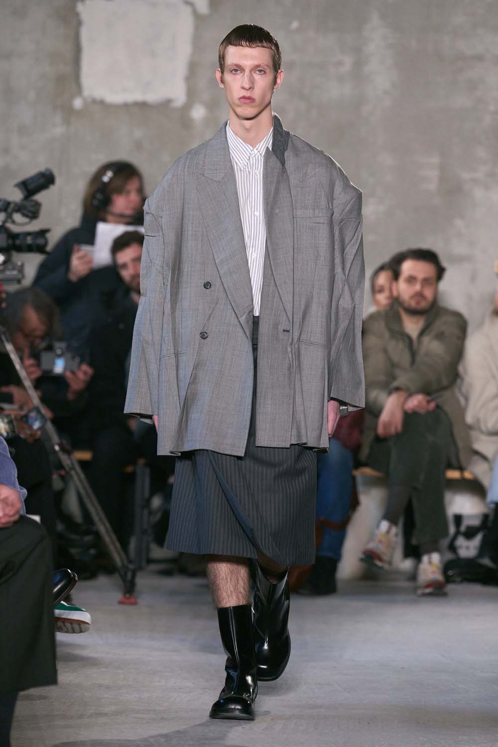 A grey oversized jacket with a grey pinstripe skirt at Hed Mayner. The micro fringe is 100% a vibe.