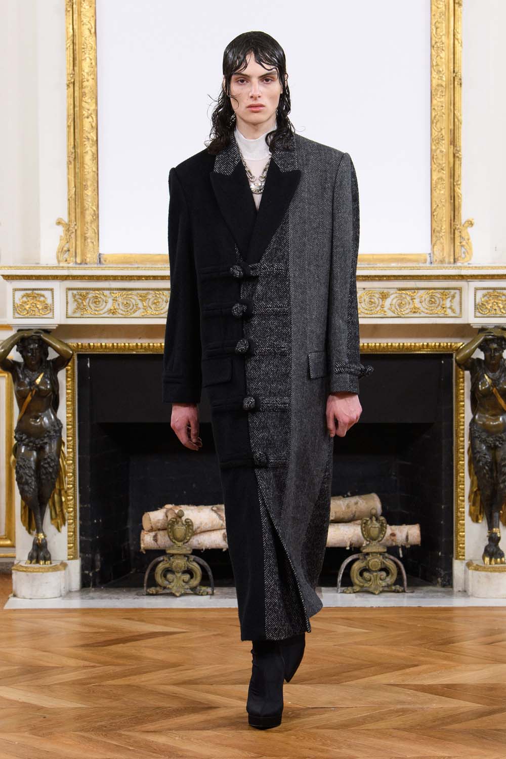 A similar contrast style, this time in a full-length coat. Sculpted wet-look hair in a longer length adding to the eleganza of Feng Chen Wang’s collection.