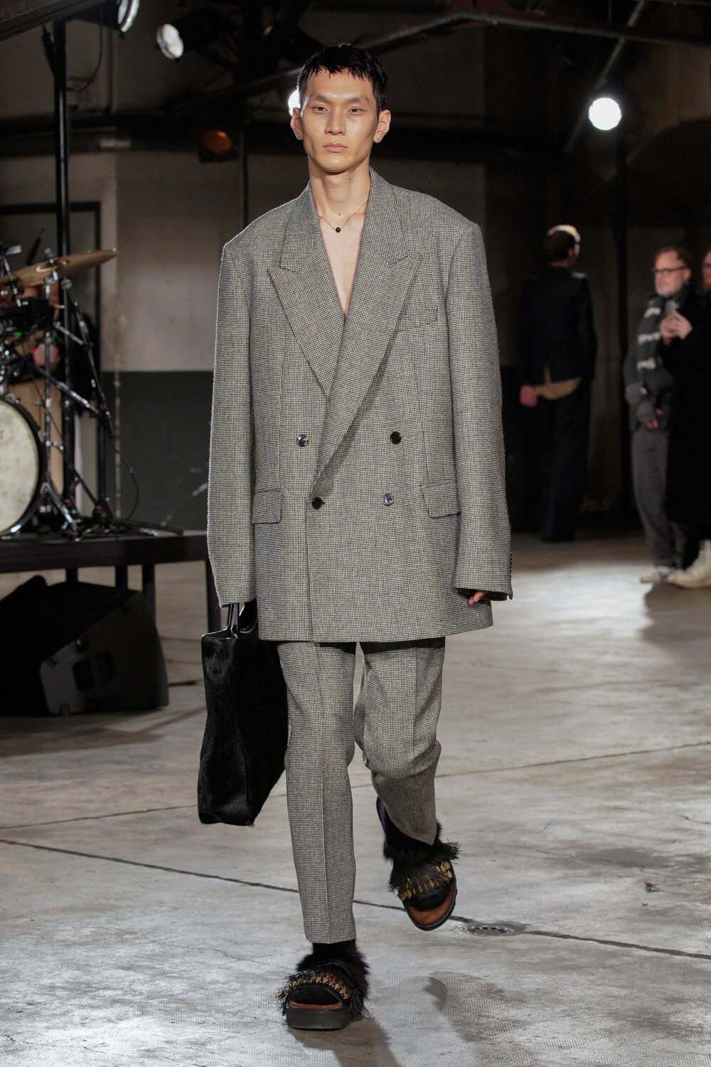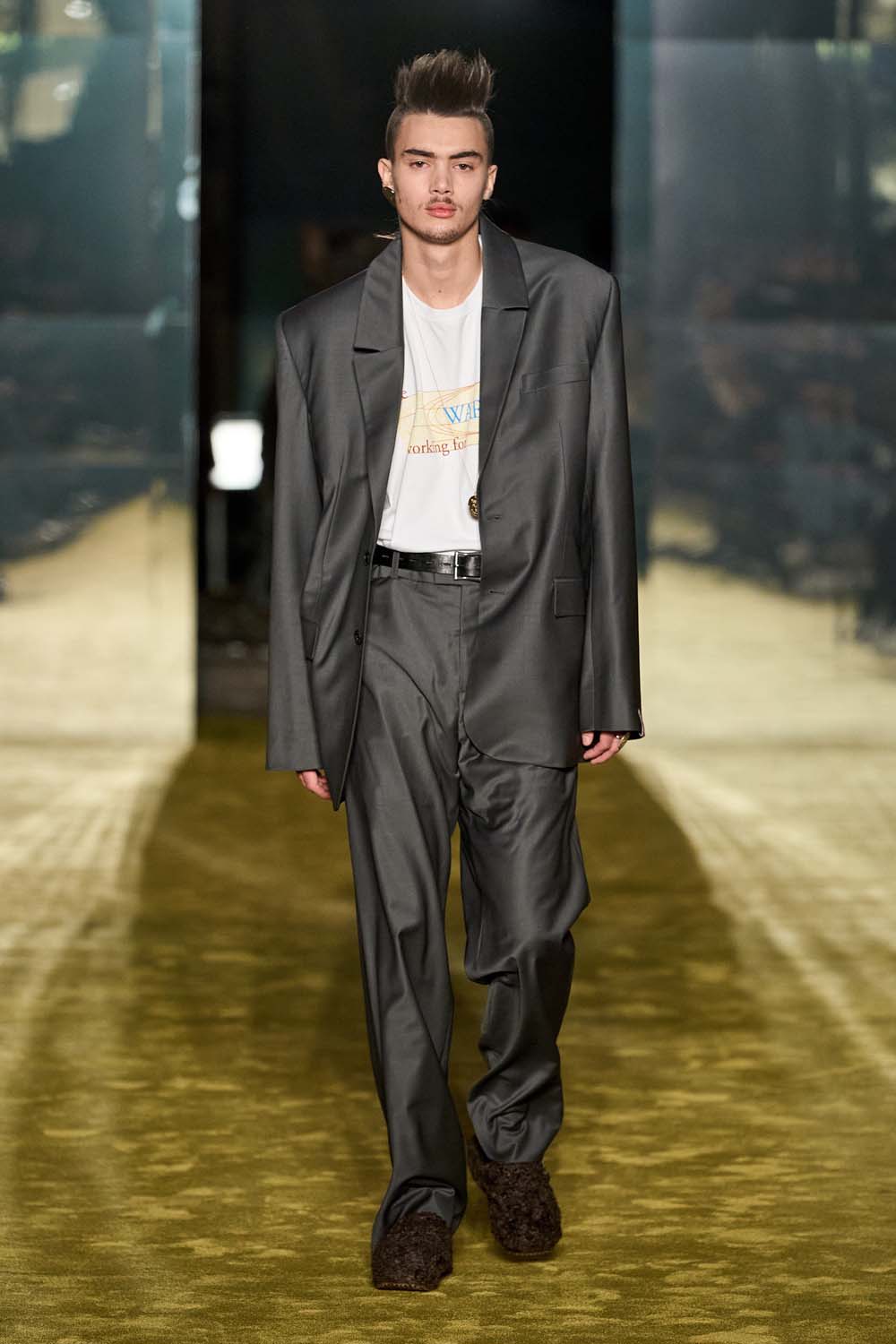 A charcoal grey oversized suit is perfectly styled with a graphic tee, brown shearling mules, an 80s-looking pompadour/mullet and a wispy moustache. We salute your vision, Martine.