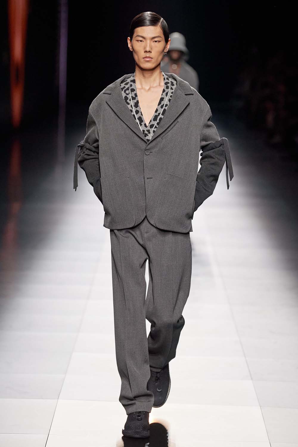 For Dior Men, Kim Jones took references from Dior himself and the early work by Yves Saint-Laurent. Models were boyish with slick side parts that look almost private school-esque. Animal print was used as a nod to Yves' love of leopard print, and tones of grey added to Kim’s penchant for a minimalist streetwear aesthetic.