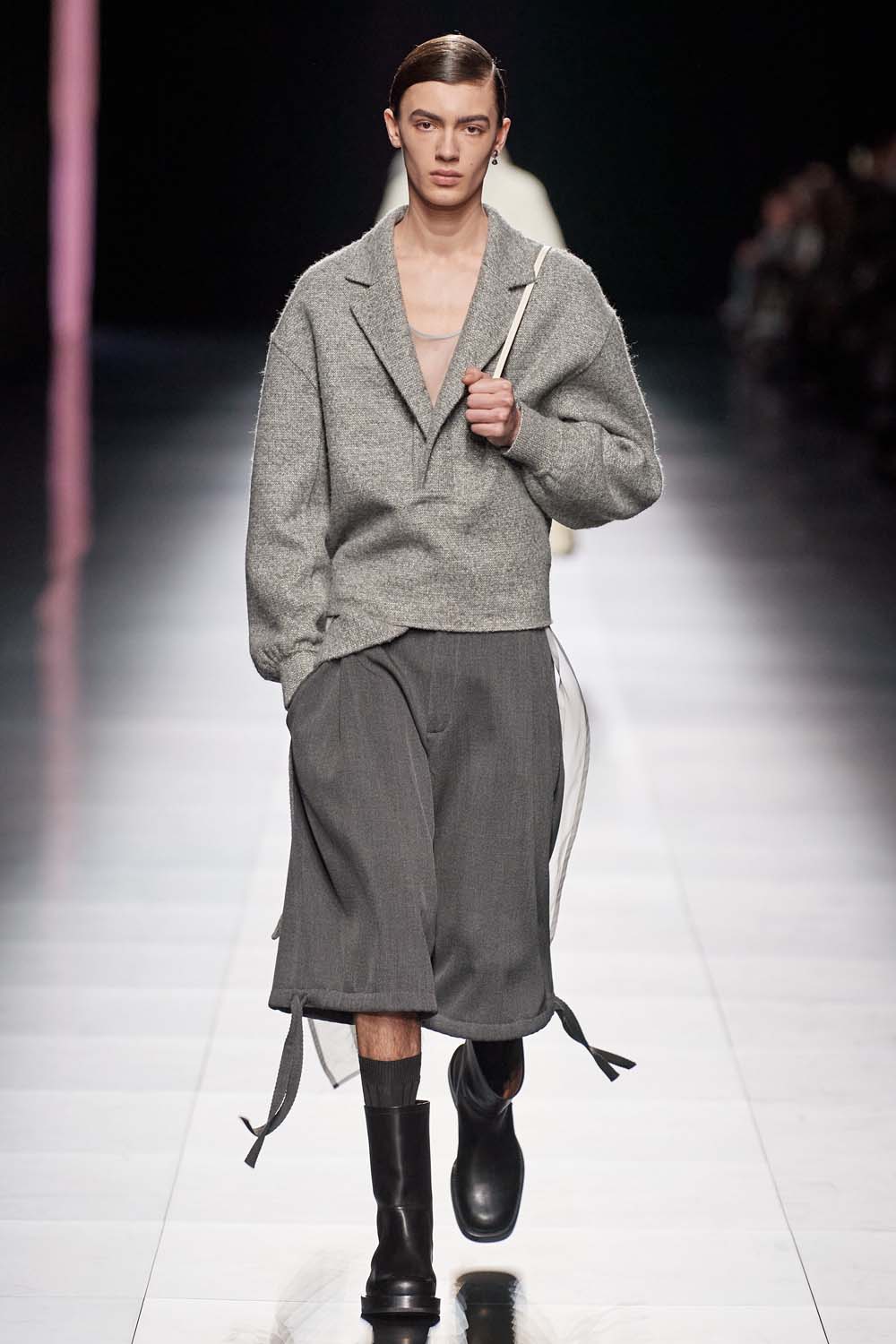 Kim Jones sent a slew of fisherman-inspired looks down the runway in tones of grey. Baggy knee-length shorts were inspired by Dior womenswear and looked almost skirt-like as the models walked the runway.