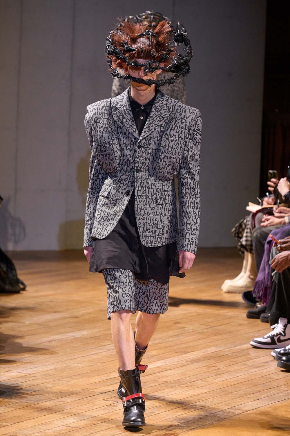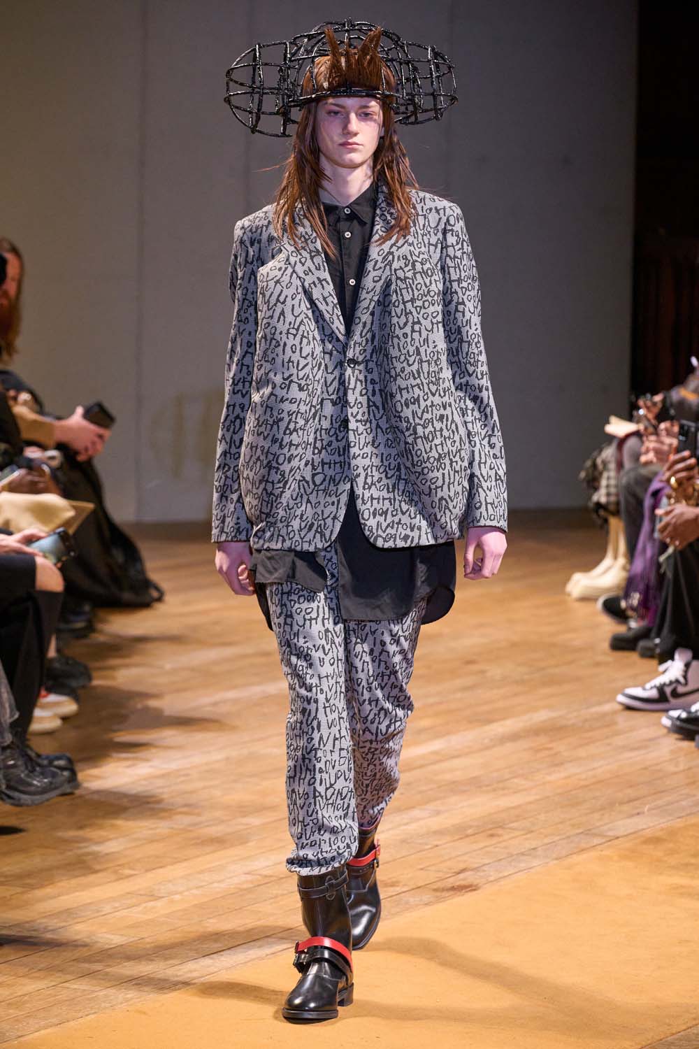 For the Fall 2023 Comme Des Garcon Homme Plus Collection, Rei Kawakubo did what she does best. The shapes were (as always) avant-garde. Grey suiting was blazoned with text and reshaped the body. Models wore cage-like headpieces with sections of hair flattened and spiked. It was a très arty.