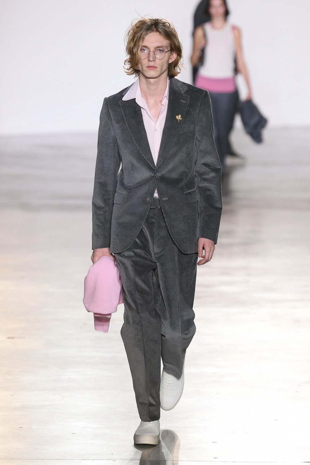 A padded suit in grey walks the Fall 2023 Comme Des Garcon Homme Plus Runway. Sculptural forms were continued into the hair. Erect fringes are a thing, get into it.