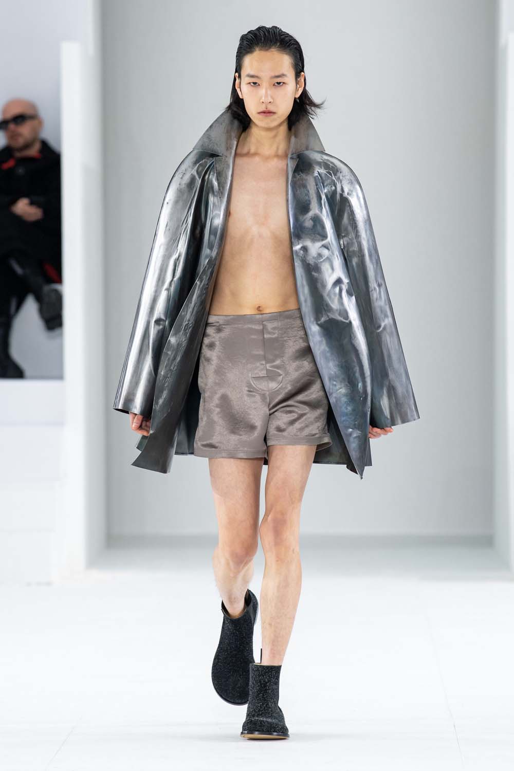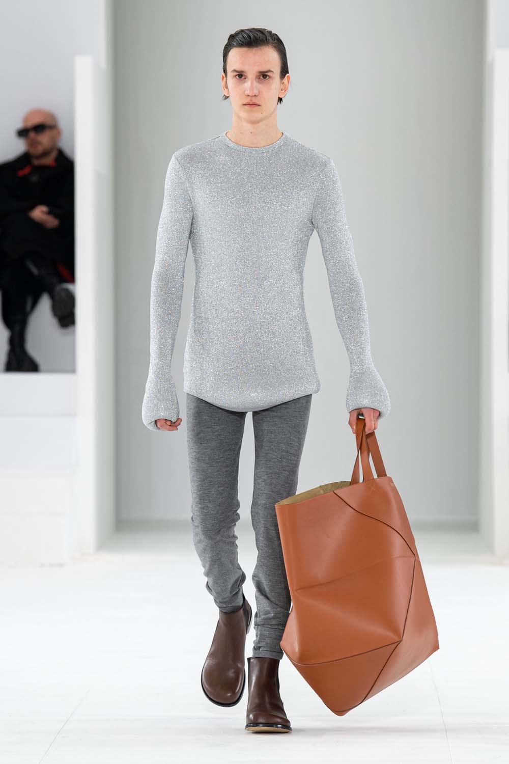 A silver, metal sculpted coat walks the runway for Loewe Fall 2023. The perception of grey, boring garments is flipped on its head to finish up this analysis of the Fall 2023 Menswear shows.