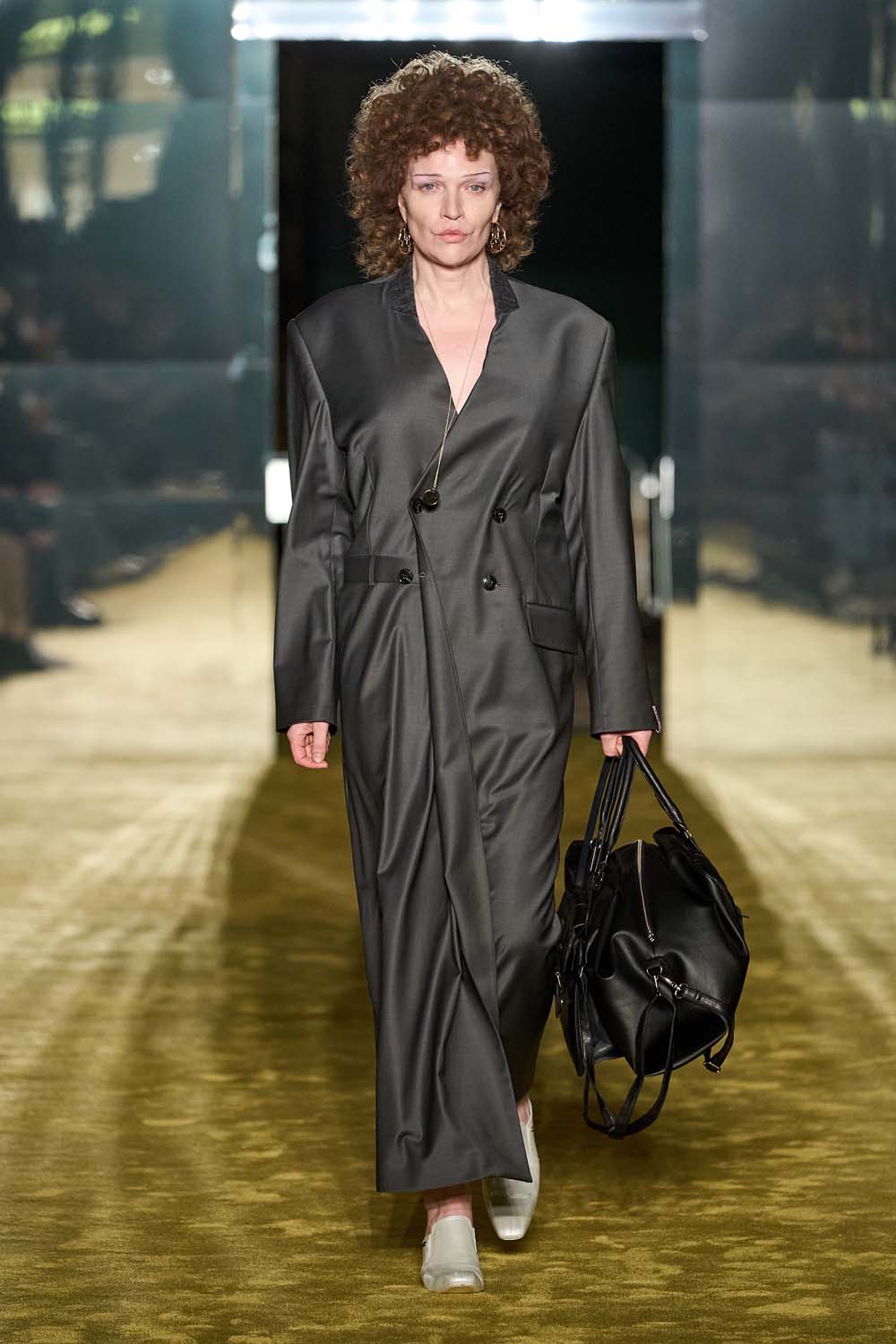 Fashion Editor, Anna Dello Russo, once famously put forward the idea of wearing a coat as a dress in her hit single ‘Fashion Shower’ and we love how Martine Rose presented this concept on the runway. An ankle-length charcoal grey coat dress is finished off with Wiggy curls and pencil-thin eyebrows. Pump up the volume!