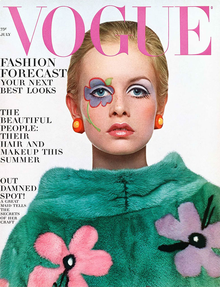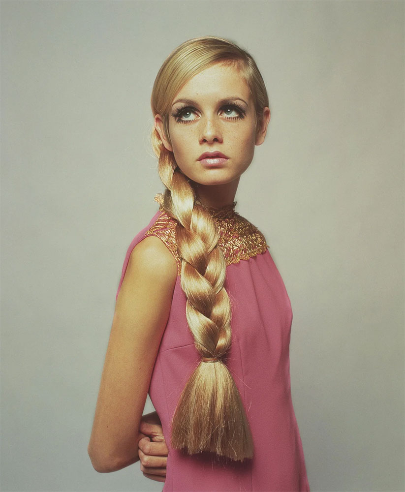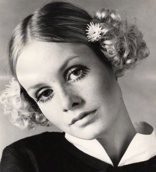 Twiggy worked regularly with photographer Bert Stern this year, including this image with a very late 60s hairdo: centre-part, curly pompom style pigtails and flowers.