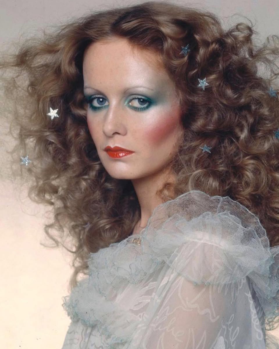 Despite 'retiring' from modelling in 1970 - saying "You can't be a clothes hanger for your entire life!" - Twiggy still appeared on fashion magazine covers. This fantastical shot was from the 1974 Christmas cover of British Vogue, with voluminous curls studded with stars.