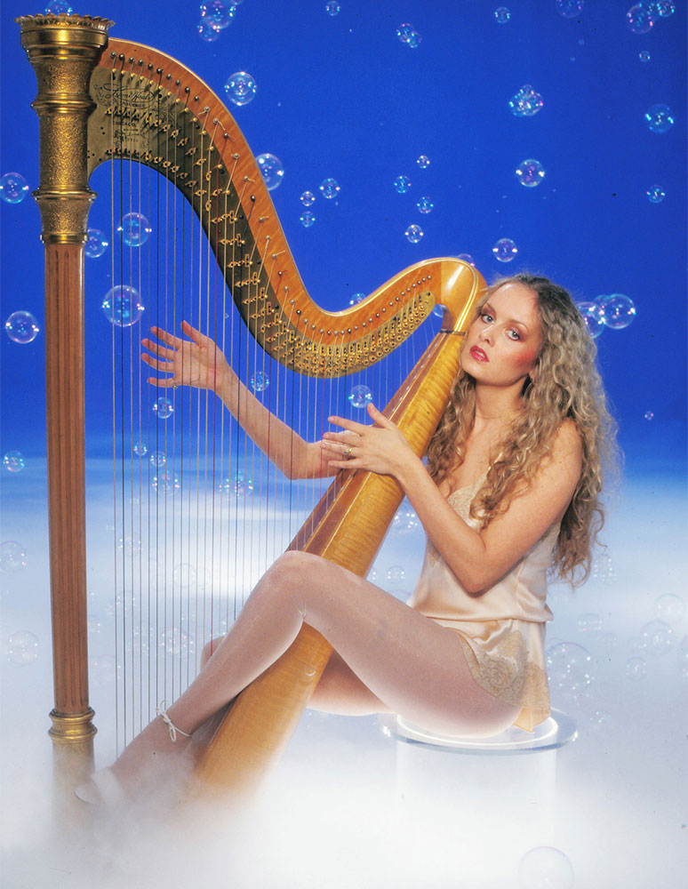 Long golden curls go perfectly with a golden harp.
