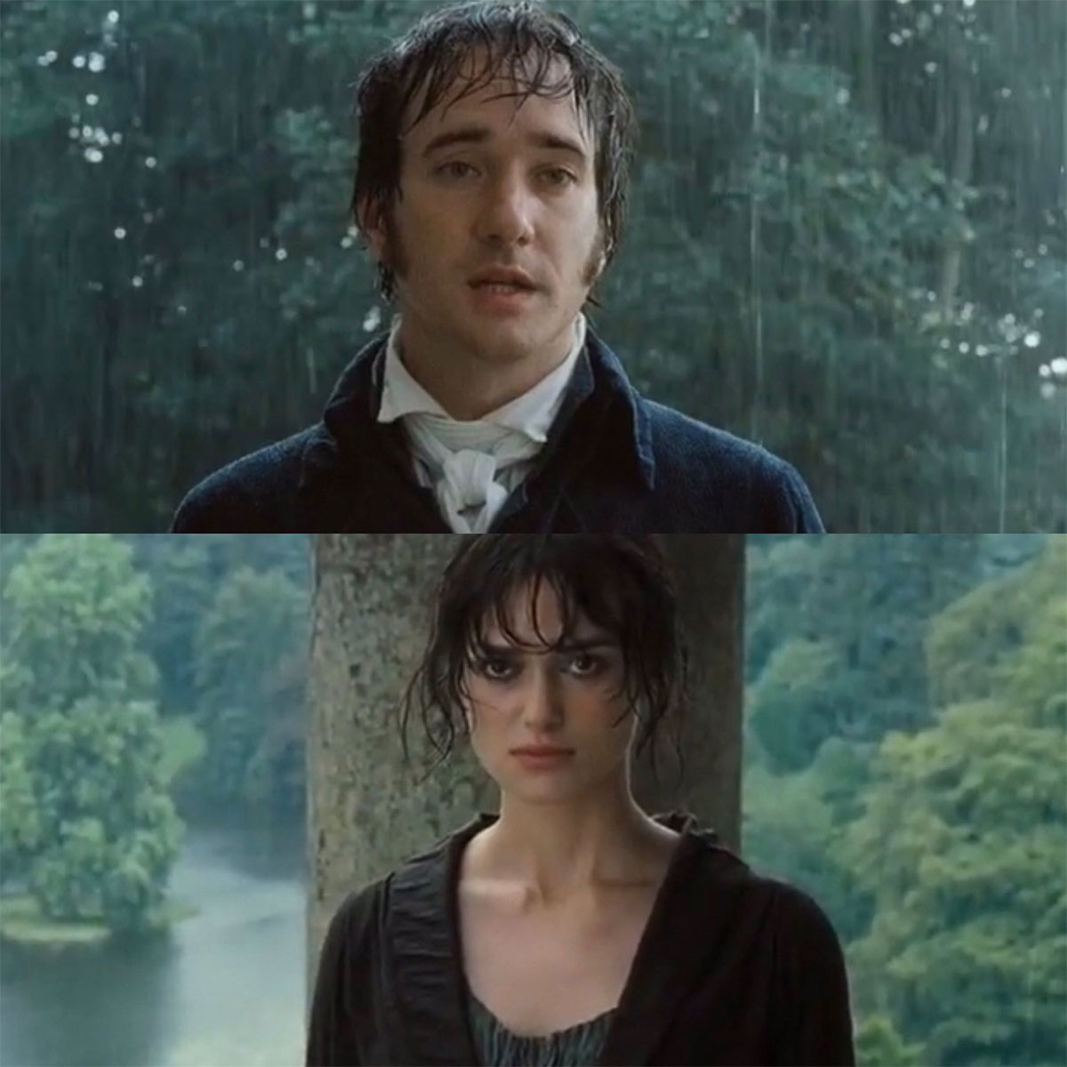 Sodden looks of love between Elizabeth Bennet (played by Keira Knightley) and Mr. Darcy (Matthew MacFadyen). Can you imagine your fringe looking as chic as this in a storm?