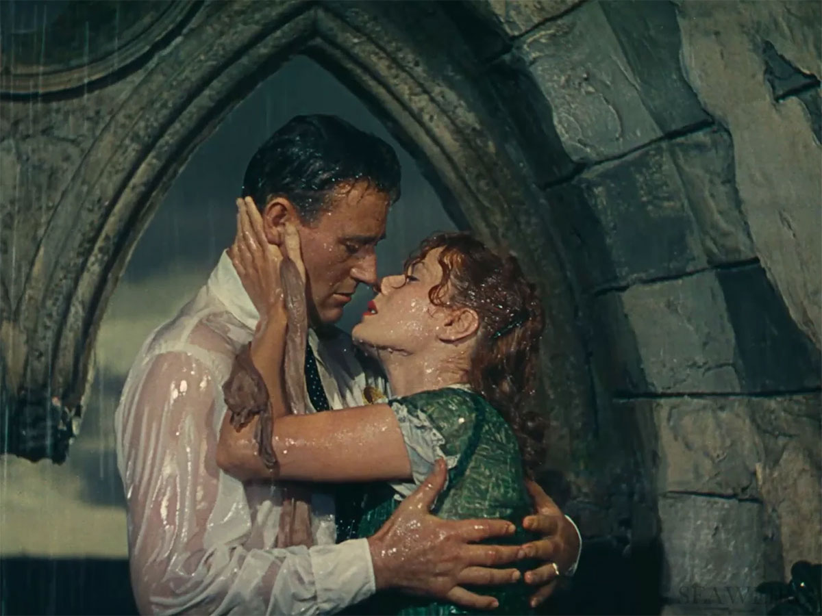 An early example of a rain scene in film saw John Wayne and Maureen O'Hara soaked in certain parts, but their hair still perfectly done.