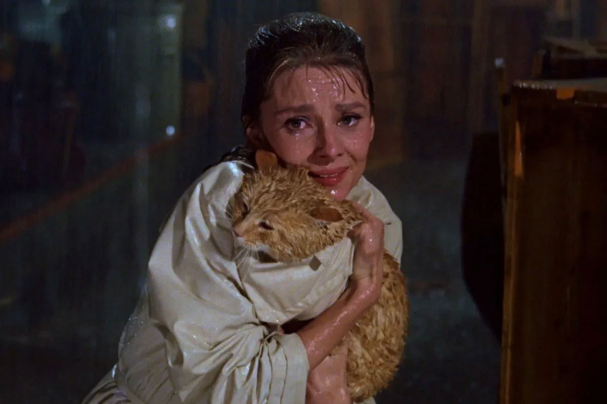 A slightly beehived Holly Golightly reunites with Cat in a rainy alleyway. The best part of this hair look is that it's actually pigtails.