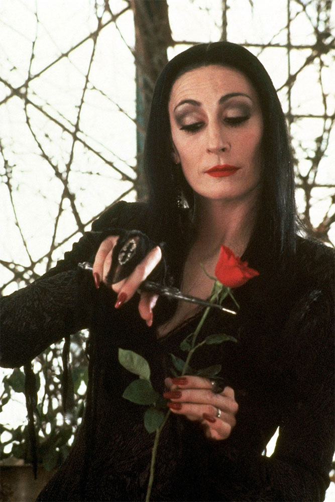 Morticia Addams' long, inky hair has become the ultimate witch symbol. Another iconic look of dark allure from Anjelica Huston.